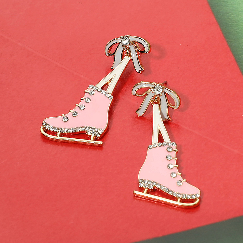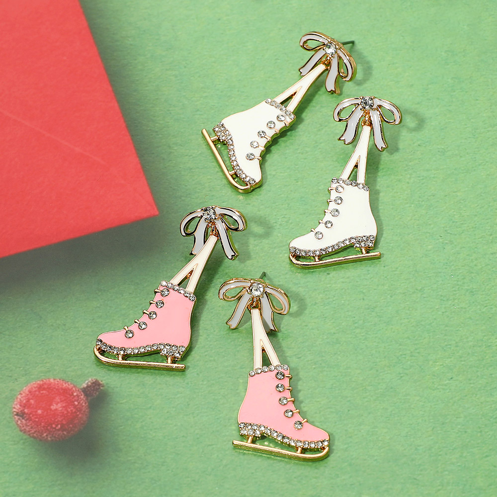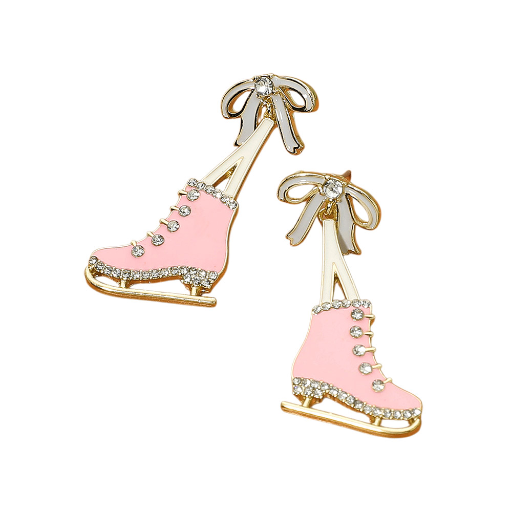 Details • Size : 0.75" X 1.75" • Post Back • Add a playful winter charm to your look with these ice skate dangle earrings. Adorned with sparkling crystal details and bow accents, they bring a festive and stylish touch, perfect for holiday parties, seasonal outfits, or gifting. • Lead and Nickel Compliant