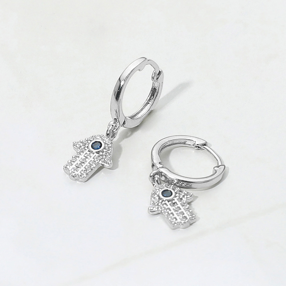 Details • Size : 0.5" X 1" • Huggie Back • Elegant hoop earrings featuring a dangling hamsa charm, a symbol of protection, luck, and positive energy. Accented with sparkling details, these versatile earrings bring both style and meaning, making them perfect for daily wear, layering with other jewelry, or gifting as a thoughtful accessory. • Brass • CZ Cubic Zirconia • Lead and Nickel Compliant