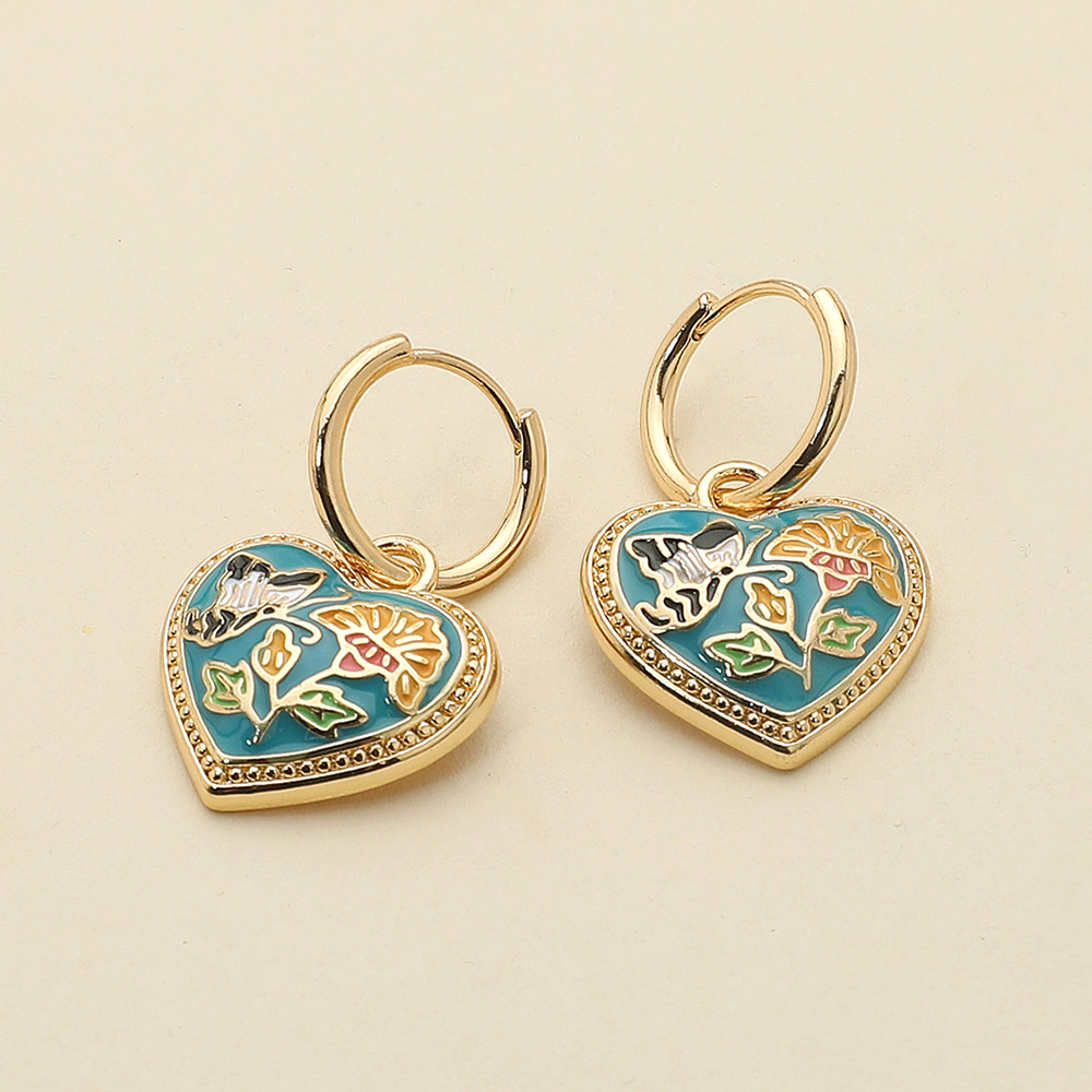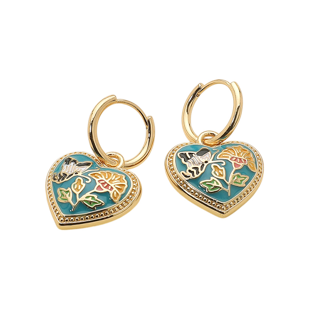 Details • Size : 0.75" X 1.2" • Huggie Back • Add charm to your style with these heart hoop earrings featuring delicate floral enamel details. Their unique design combines elegance and playfulness, making them perfect for everyday wear or special occasions. A stylish accessory and thoughtful gift choice. • Lead and Nickel Compliant • Brass
