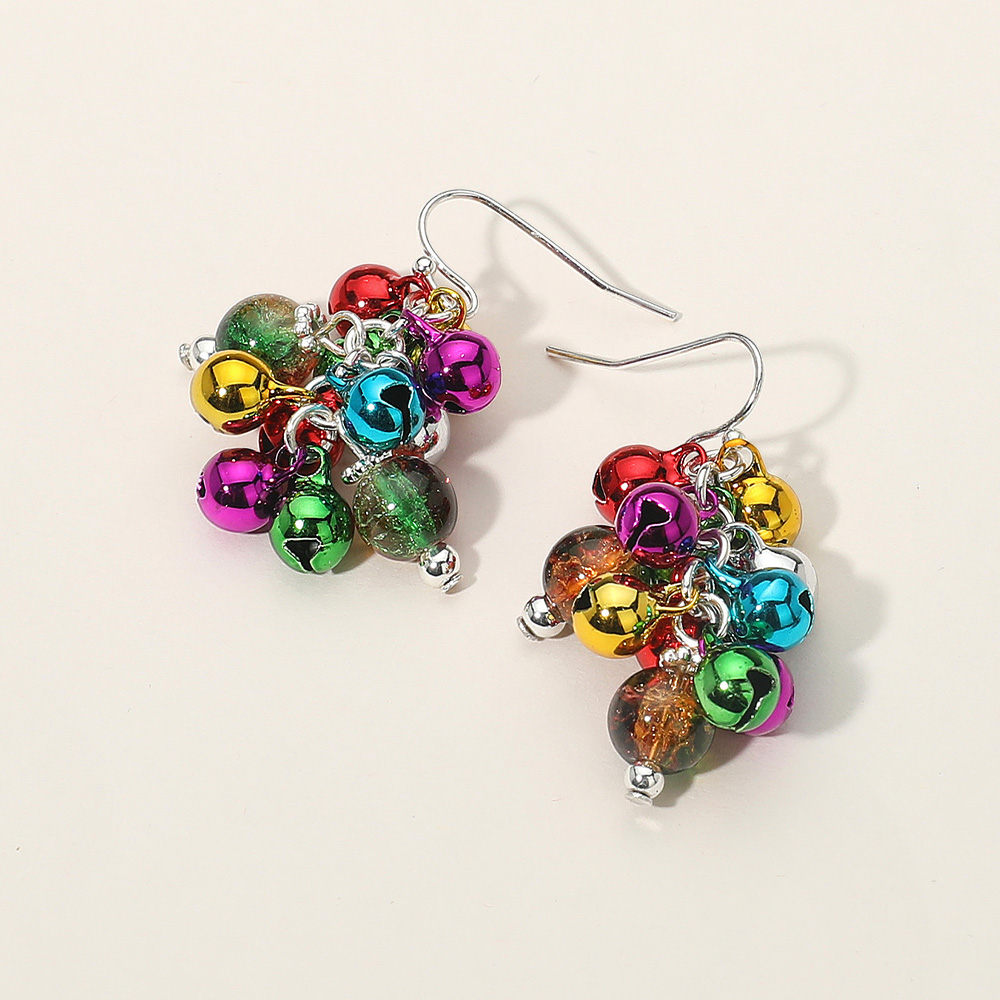 Details • Size : 0.8" X 1.6" • Fish Hook Back • Add a playful and festive touch to your look with these delightful Charm Cluster Dangle Earrings. Each piece features a vibrant cluster of tiny, multi-shade jingle bells mixed with unique crackle-glass beads. The shiny, metallic bells and iridescent glass create a sparkling, eye-catching effect. These earrings offer a fun, youthful statement perfect for holidays, parties, or adding a joyful pop to any casual outfit. They are lightweight and hang from secure sterling silver-plated fish hooks. • Lead and Nickel Compliant
