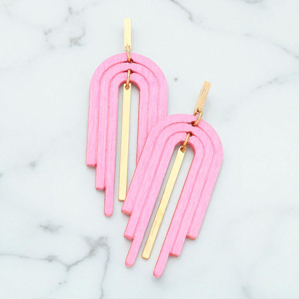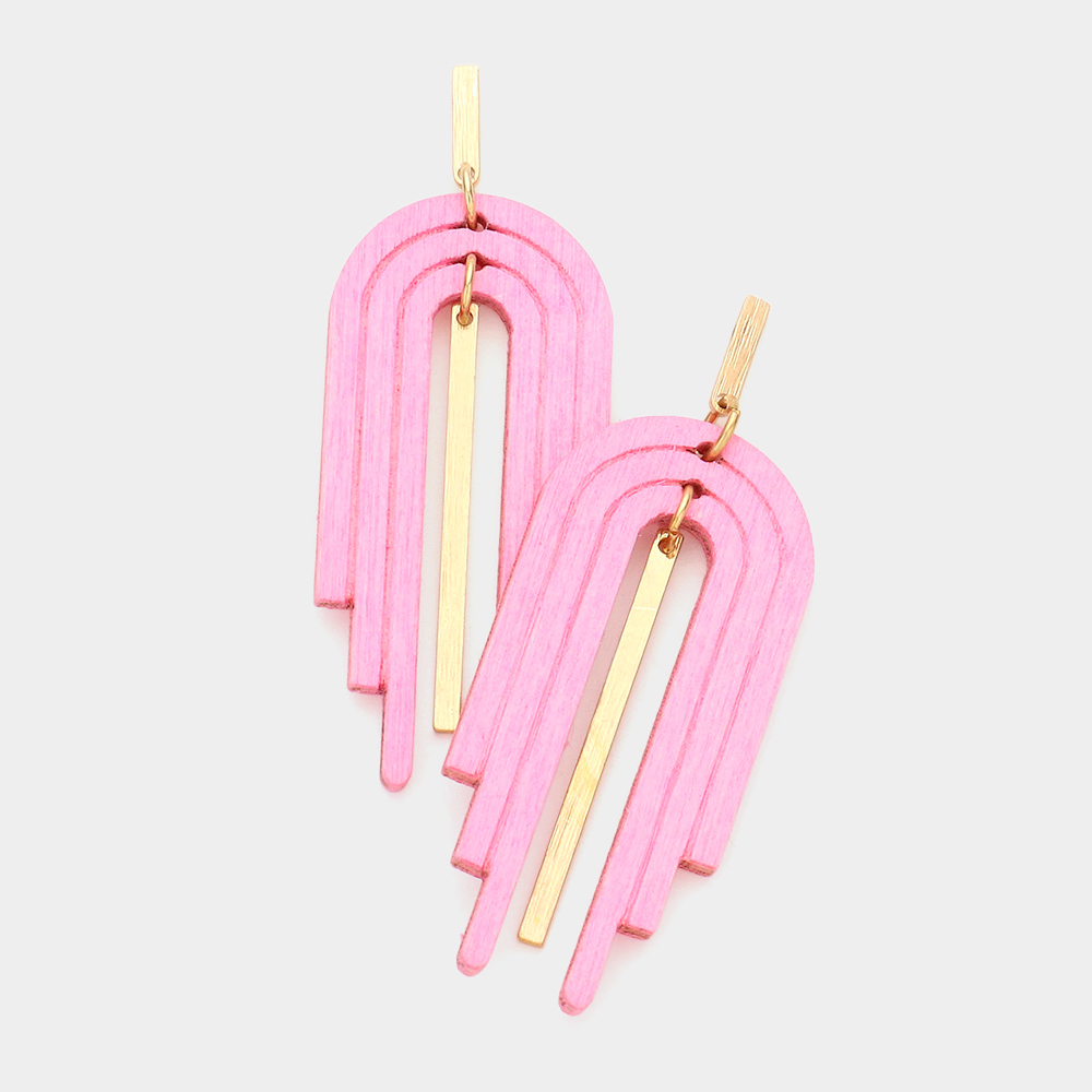 • Trendy geometric dangle earrings featuring layered arch shapes paired with sleek metallic accents. Lightweight and stylish, these earrings bring a modern pop to casual wear or add a fun twist to evening looks.