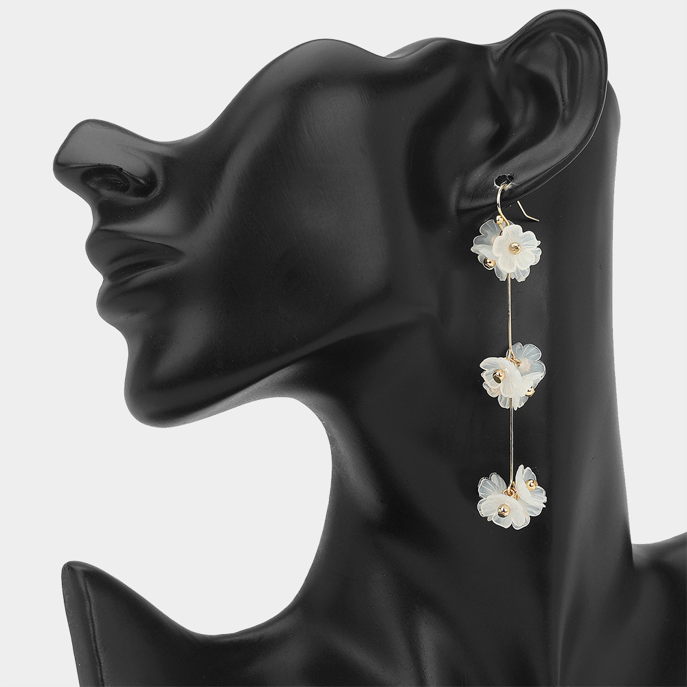 Details • Size : 0.75" X 3" • Fish Hook Back • Showcase elegance with these triple floral drop earrings featuring three blossoms aligned along a fine chain. Lightweight and stylish, they bring graceful movement and a romantic charm, making them a perfect accessory for both everyday wear and special occasions. • Lead and Nickel Compliant