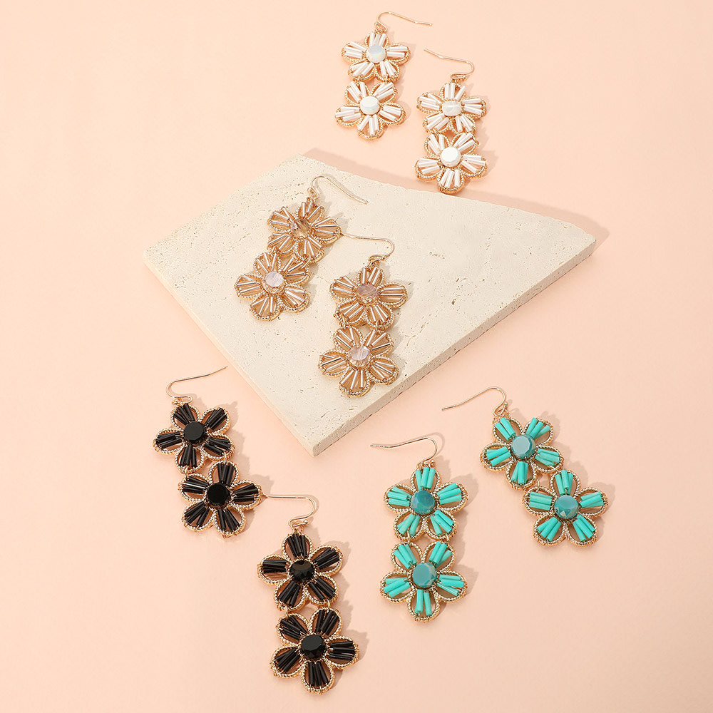 Details • Size : 1" X 2.7" • Fish Hook Back • Chic dangle earrings featuring intricately crafted floral elements with a double bloom layout. These elegant pieces offer a bold yet graceful silhouette, ideal for enhancing both everyday looks and formal wear. Perfect for adding flair and detail to any jewelry collection. • Lead and Nickel Compliant