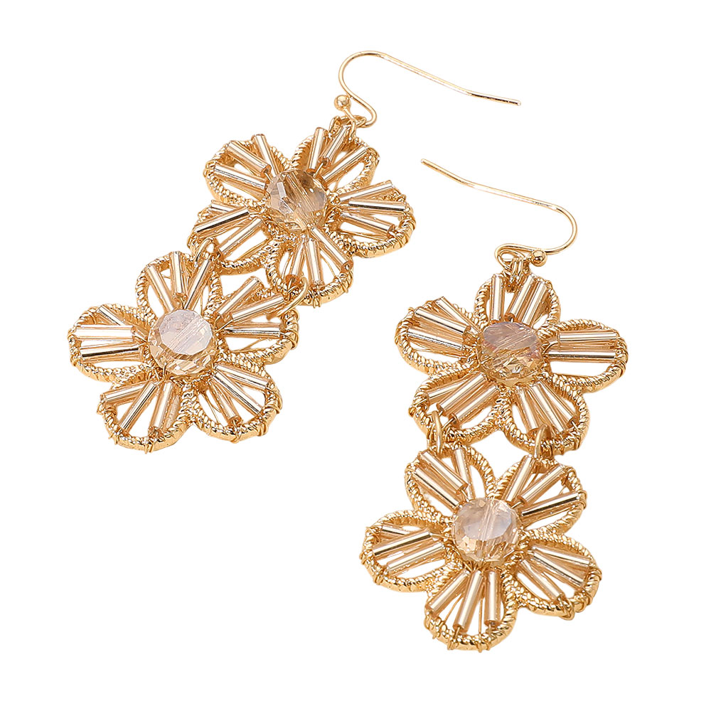 Double Flower Faceted Beaded Link Drop Dangle Earrings