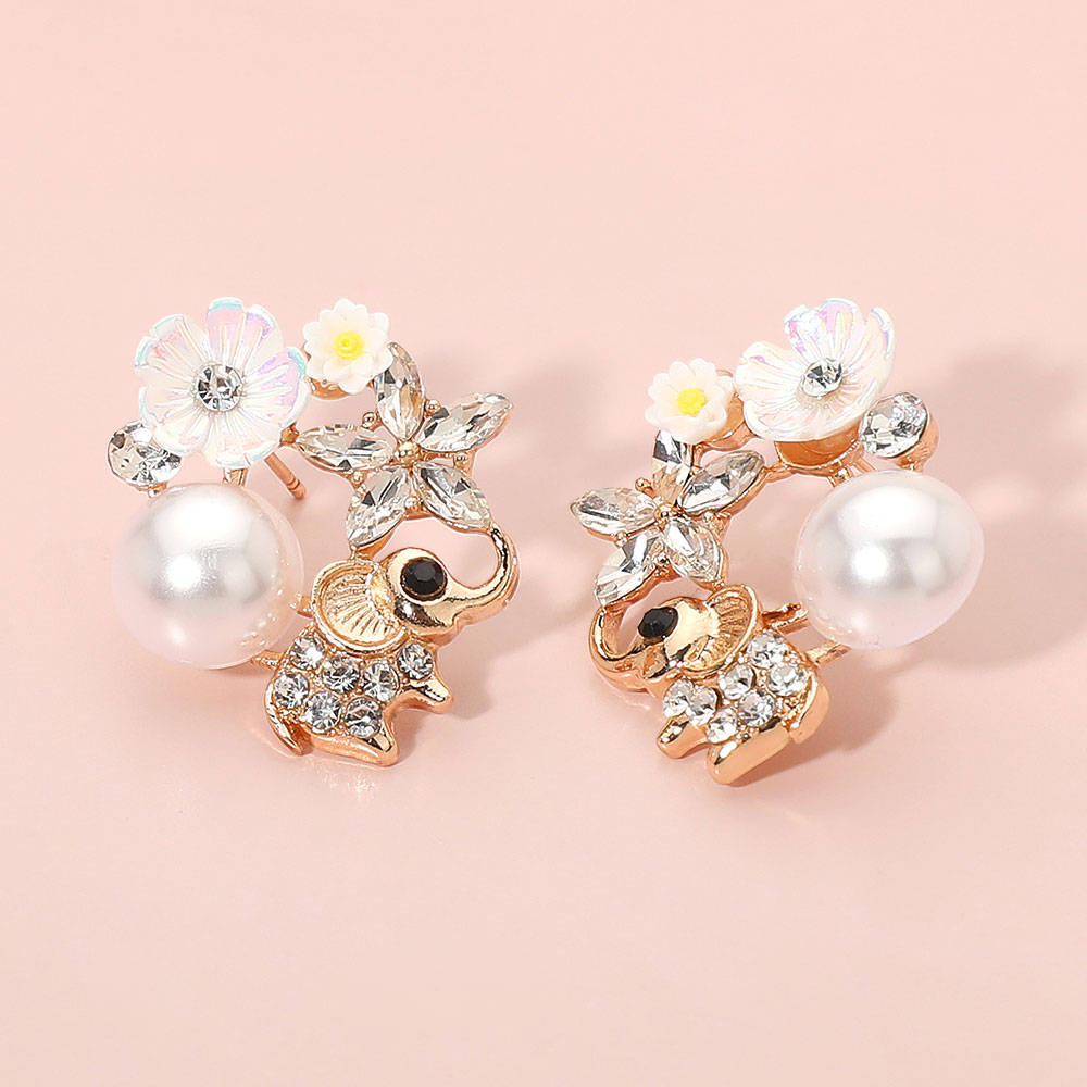 Details • Size : 1.25" X 1.25" • Post Back • Whimsical stud earrings featuring adorable elephant charms adorned with crystals, delicate floral details, and luminous pearl accents. A charming accessory that blends playful design with elegant sparkle, perfect for adding personality to casual or dressy looks. • Lead and Nickel Compliant