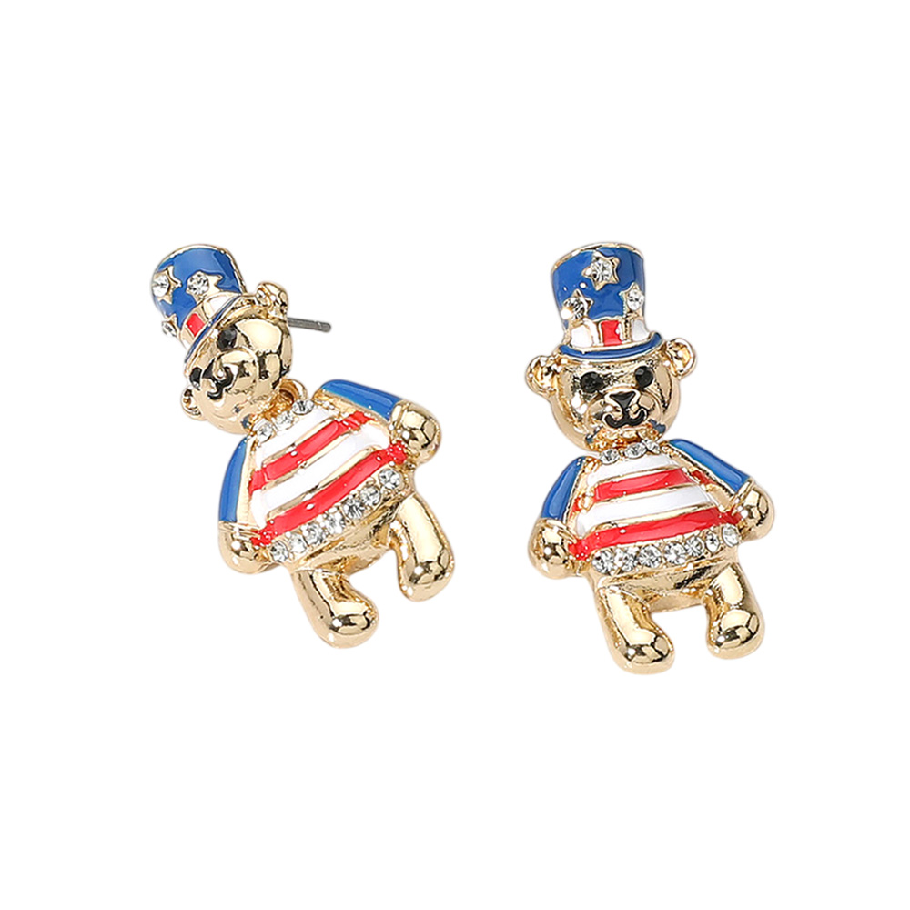 Details • Size : 0.75" X 1.3" • Post Back • Cute teddy bear stud earrings with patriotic details, perfect for festive occasions and national holidays. Add a fun, charming touch to your outfit with these novelty statement earrings. • Lead and Nickel Compliant