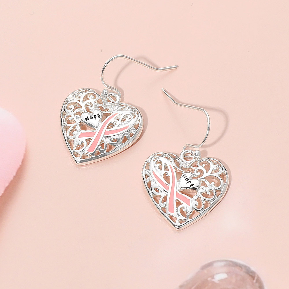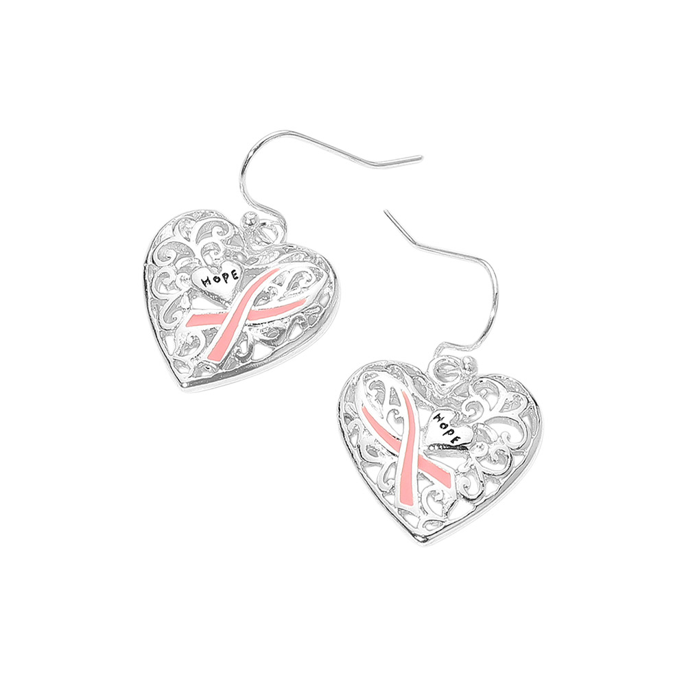 Details • Size : 0.8" X 1.25" • Fish Hook Back • Heart-shaped dangle earrings with a detailed cutout design and engraved hope ribbon accent. A meaningful accessory to support awareness causes and show strength, compassion, and resilience. • Lead and Nickel Compliant