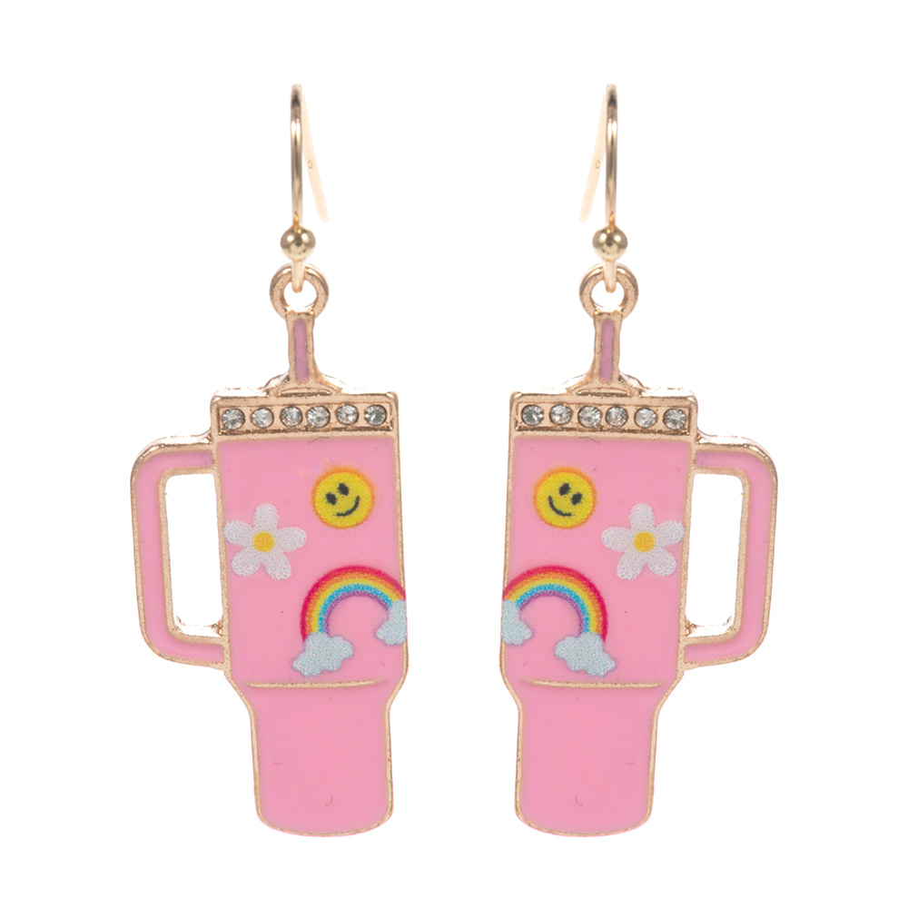 Details • Size : 0.6" X 1.6" • Fish Hook Back • Playful mug-shaped earrings featuring smiley faces, daisies, and rainbow motifs, topped with sparkling rhinestone accents. A cheerful and quirky accessory designed to add positivity and fun to your casual or festive outfits. • Lead and Nickel Compliant • Hypoallergenic