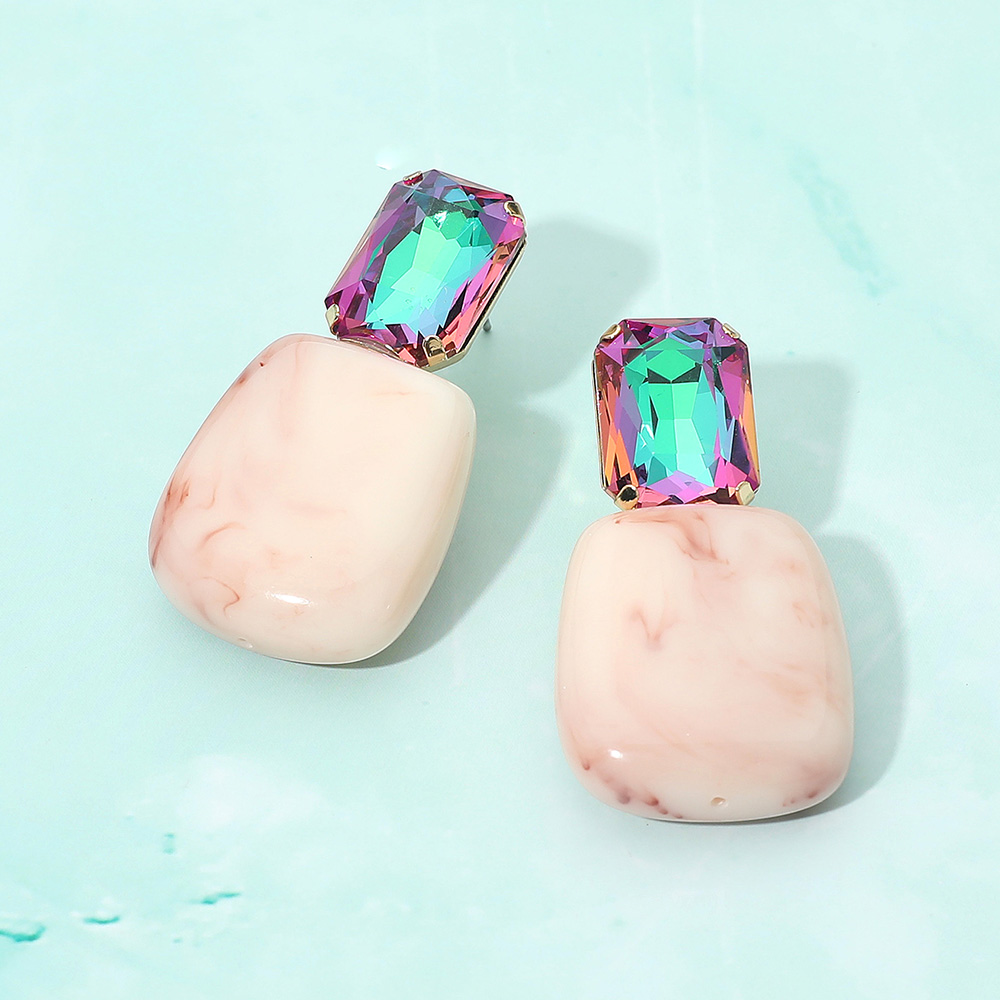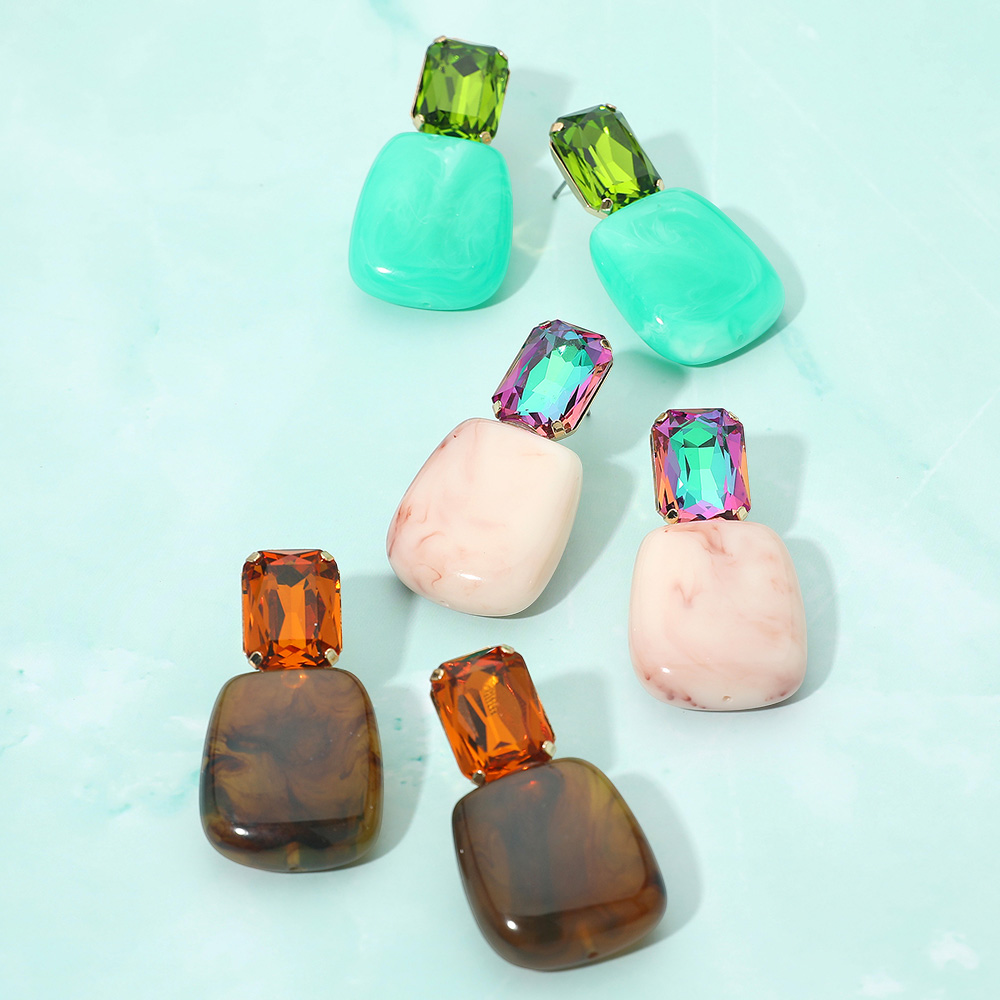 Details • Size : 1" X 1.75" • Post Back • Eye-catching drop earrings featuring faceted gem accents paired with marbled resin drops for a statement look. Designed to add elegance and flair, these earrings are perfect for parties, special events, or stylish everyday wear. • Lead and Nickel Compliant