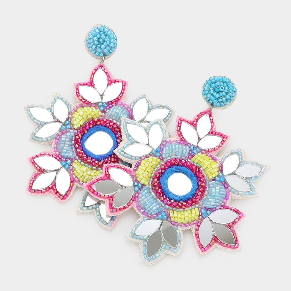 Faux Leather Back Mirror Beaded Floral Dangle Earrings