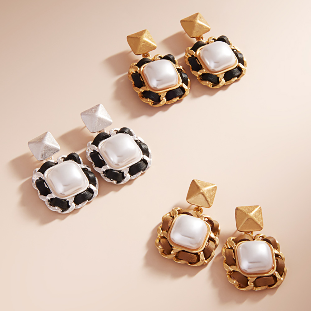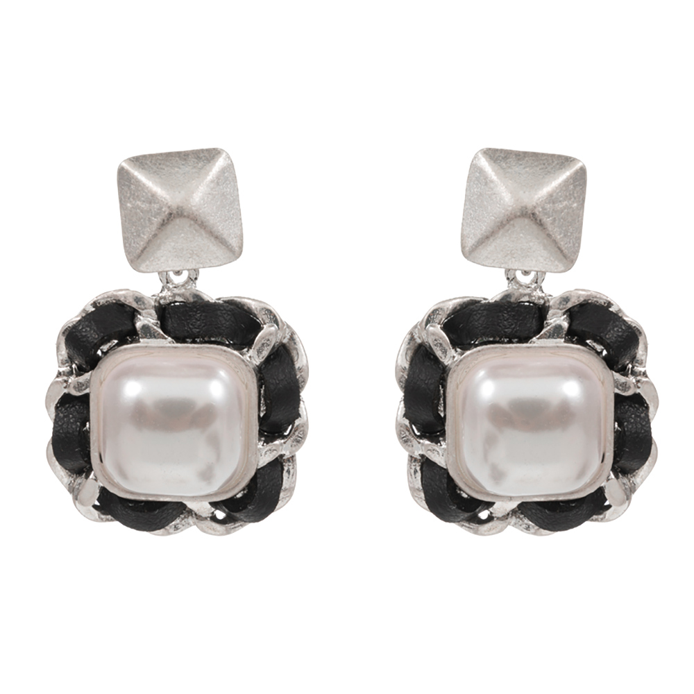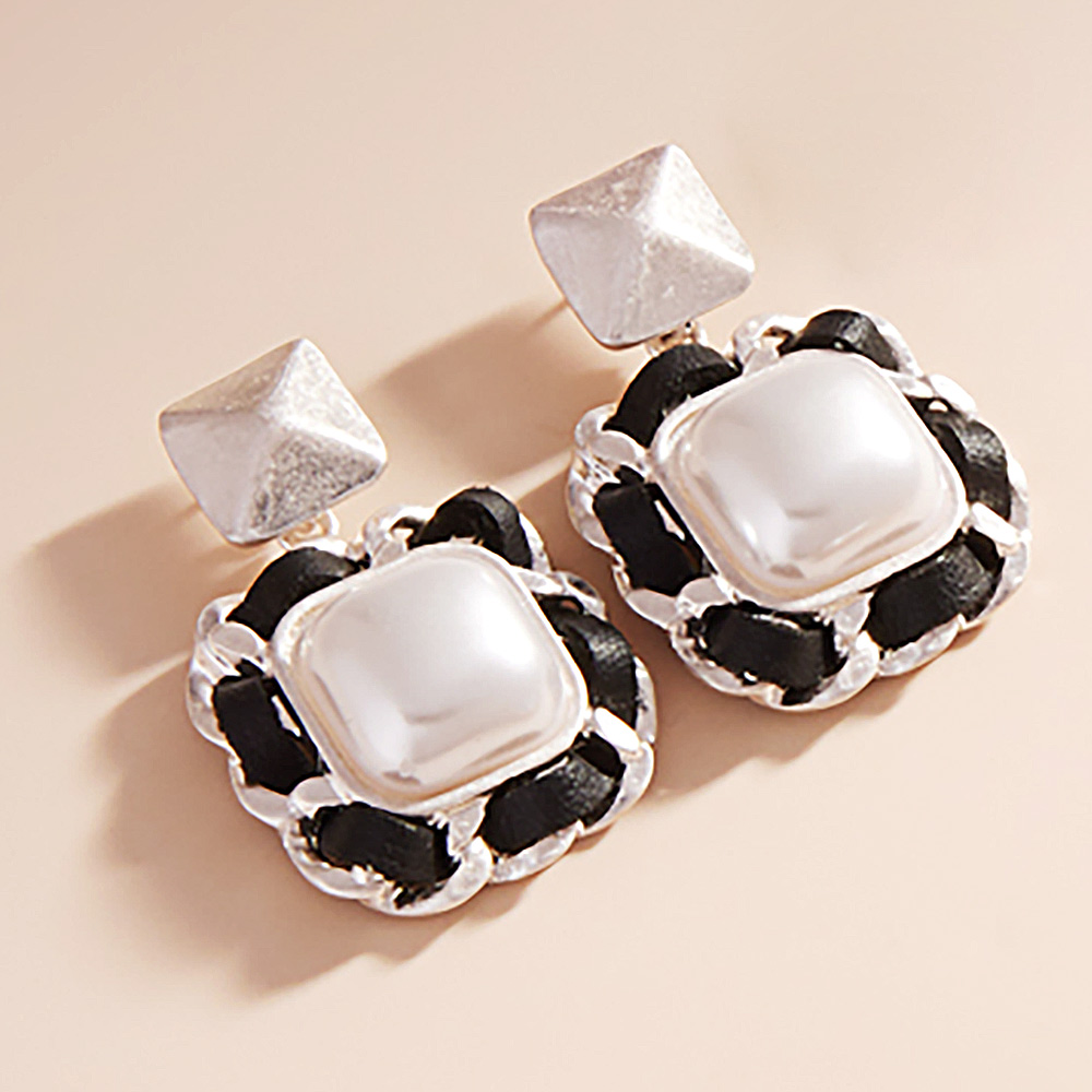 Faux Leather Braided Vintage Metal Chain Square Pearl Dangle Earrings