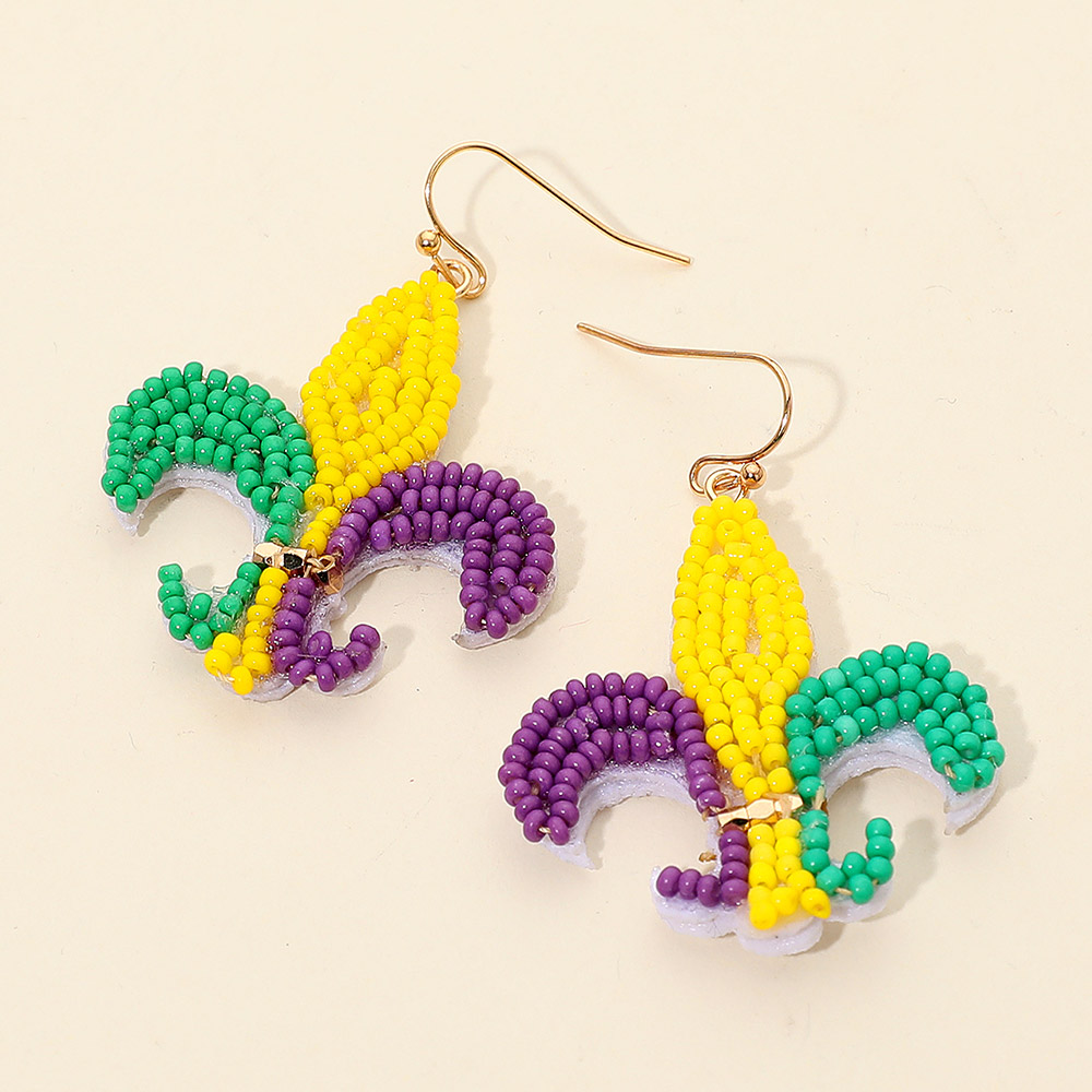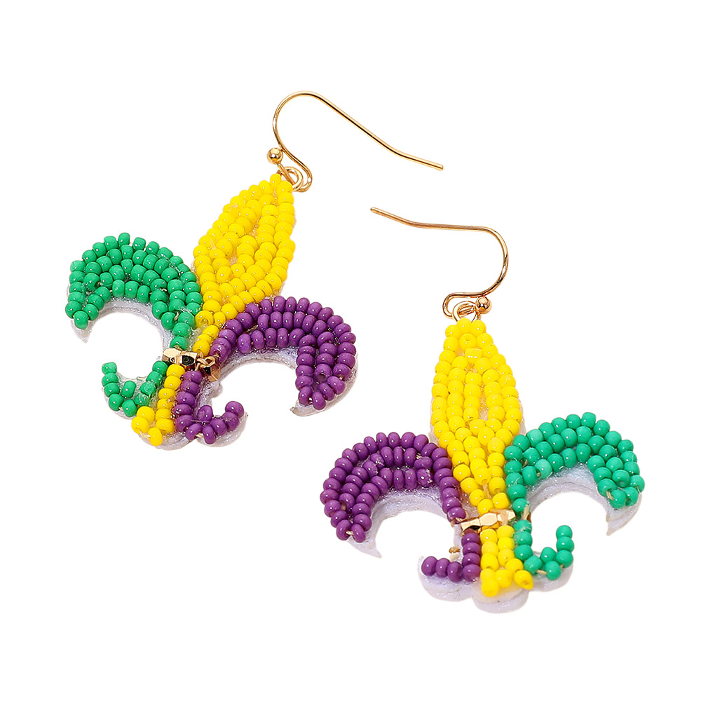 Details • Size : 1.5" X 2.1" • Fish Hook Back • Festive fleur de lis drop earrings designed to elevate Mardi Gras celebrations with playful movement and standout charm. Perfect for parades, costume parties, themed events, or fun everyday styling when you want a bold accessory that captures celebratory spirit. • Lead and Nickel Compliant