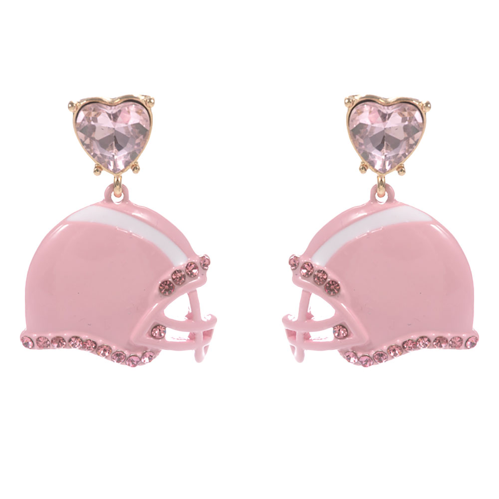 Details • Size : 1.2" X 1.5" • Titanium Post Back • These heart stud football helmet drop earrings combine playful charm with sporty flair. The unique helmet design is accented with sparkling details, creating a fun statement piece. Perfect for adding a touch of personality and style to casual outfits or themed occasions. • Hypoallergenic • Lead and Nickel Compliant