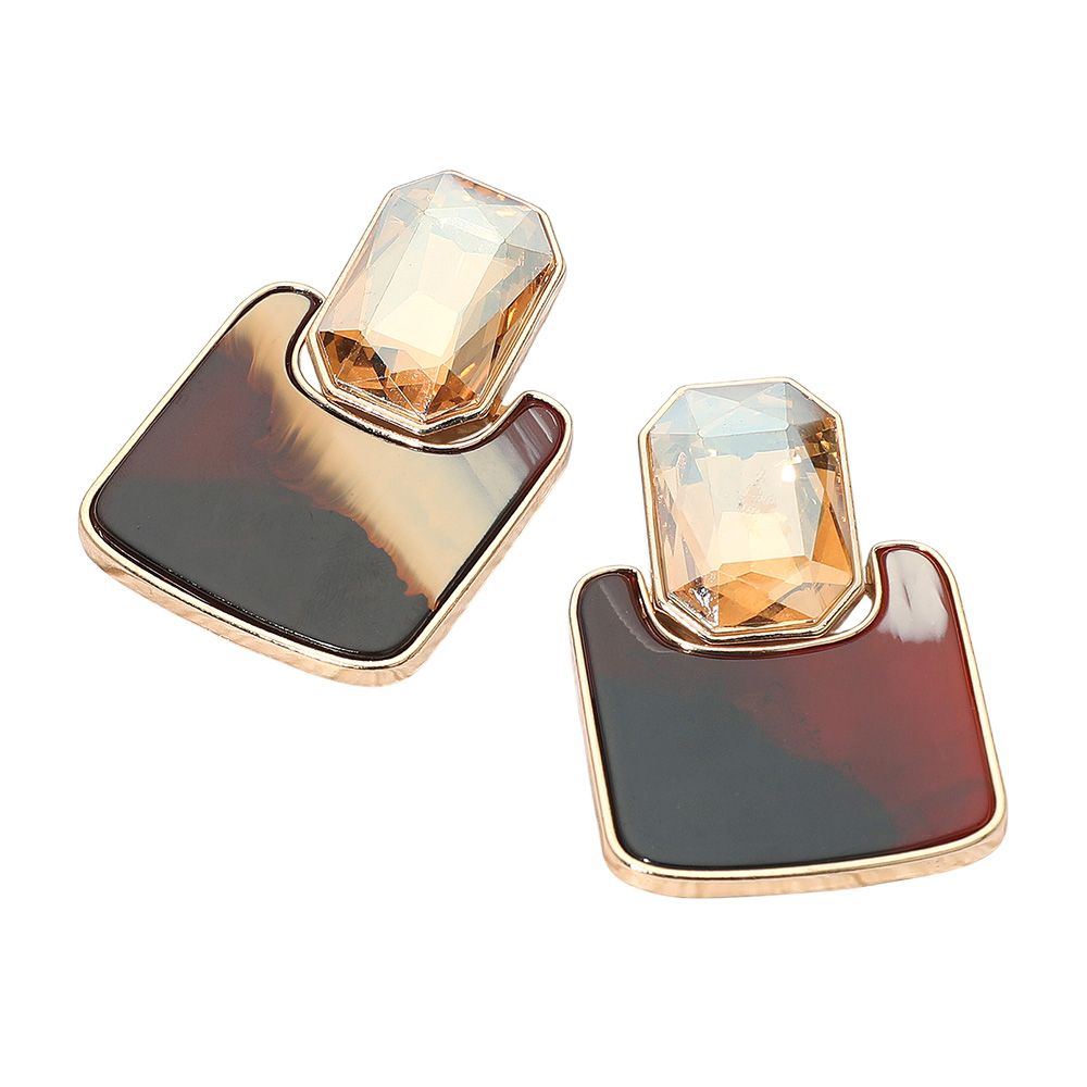 Details • Size : 1.5" X 2.1" • Post Back • Stand out with these geometric gemstone stud earrings featuring a striking print accent on resin plate. The bold contrast between faceted stones and patterned detail creates a chic, fashion-forward look—perfect for adding a statement touch to both casual and elegant outfits. • Lead and Nickel Compliant