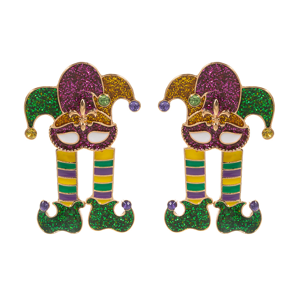 Details • Size : 1.2" X 1.75" • Titanium Post Back • Celebrate with flair wearing these glitter jester mask earrings featuring playful striped legs and sparkling accents. Designed to capture the festive spirit, they add a fun, whimsical touch to your outfit—perfect for parties, parades, and joyful occasions all year round. • Lead and Nickel Compliant • Hypoallergenic