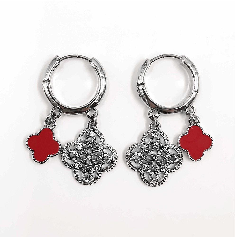 Details • Size : 0.7" X 0.9" • Huggie Back • Hoop earrings accented with delicate quatrefoil charms and intricate cutout details. Lightweight yet eye-catching, these earrings bring a touch of elegance to everyday outfits and special occasions. • Gold Dipped • Lead and Nickel Compliant