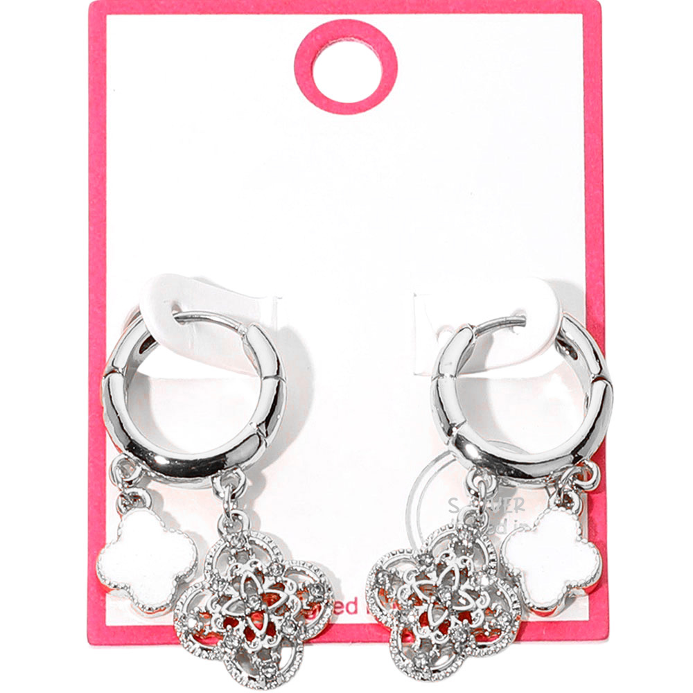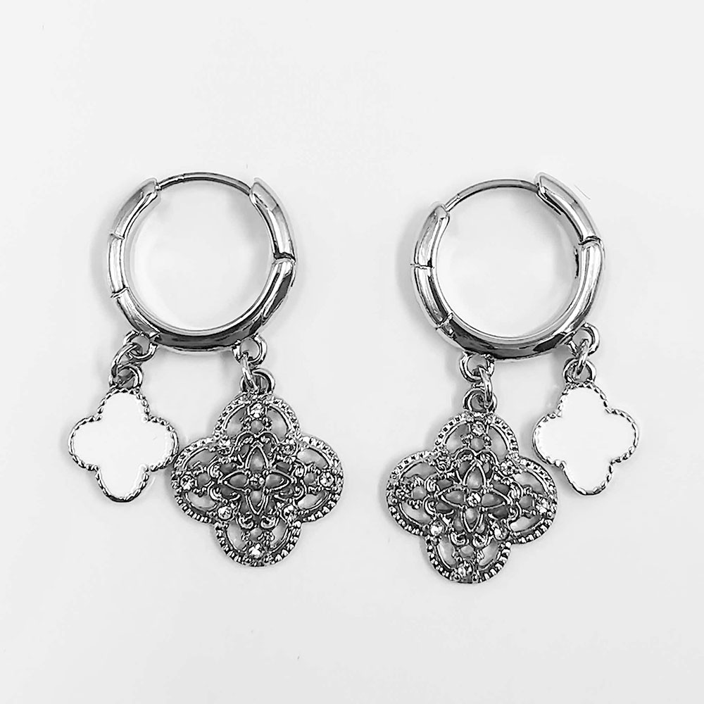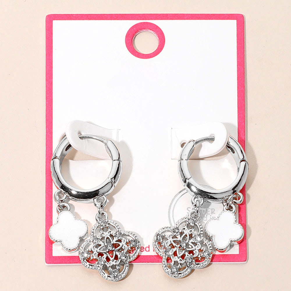 • Hoop earrings accented with delicate quatrefoil charms and intricate cutout details. Lightweight yet eye-catching, these earrings bring a touch of elegance to everyday outfits and special occasions.