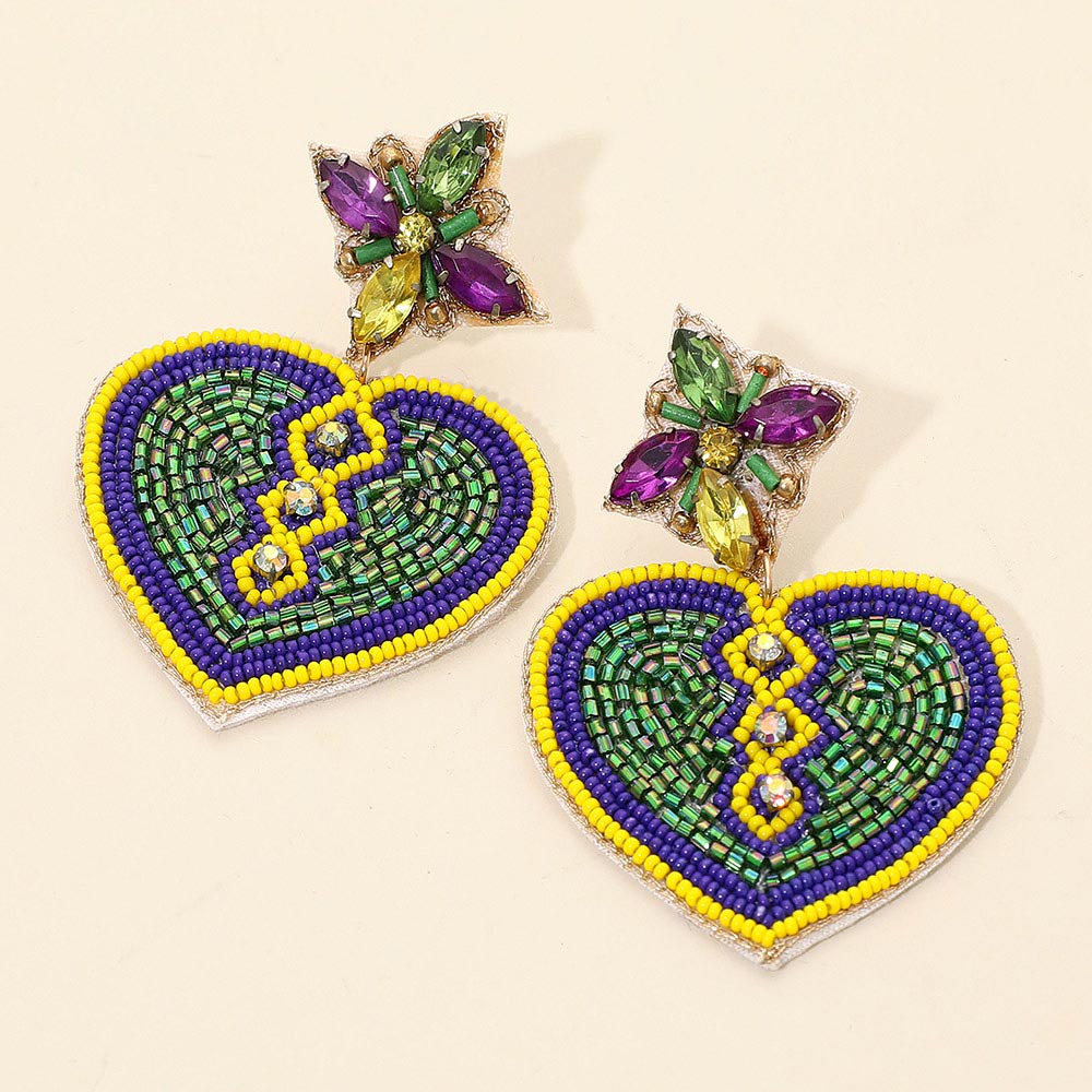 • Festive heart-shaped drop earrings designed with bold detailing and sparkling accents for standout Mardi Gras style. A playful statement piece perfect for parades, theme parties, costumes, or adding celebratory flair to everyday outfits and special events.