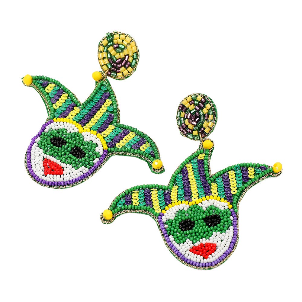 Mardi Gras Felt Back Sequin Seed Beaded Jester Pierrot Dangle Earrings