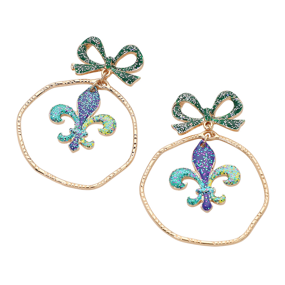 Mardi Gras Fleur De Lis Bow Hoop Drop Dangle Earrings Mardi Gras Fleur De Lis Bow Hoop Drop Dangle Earrings