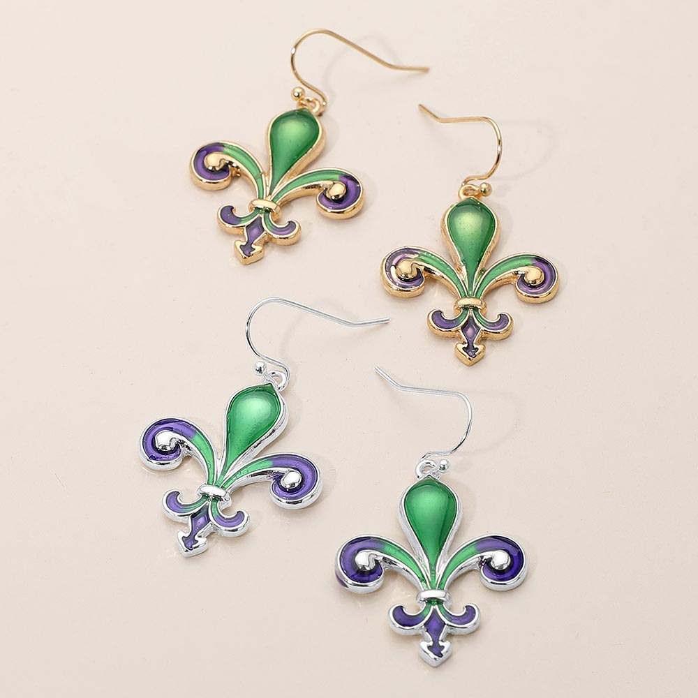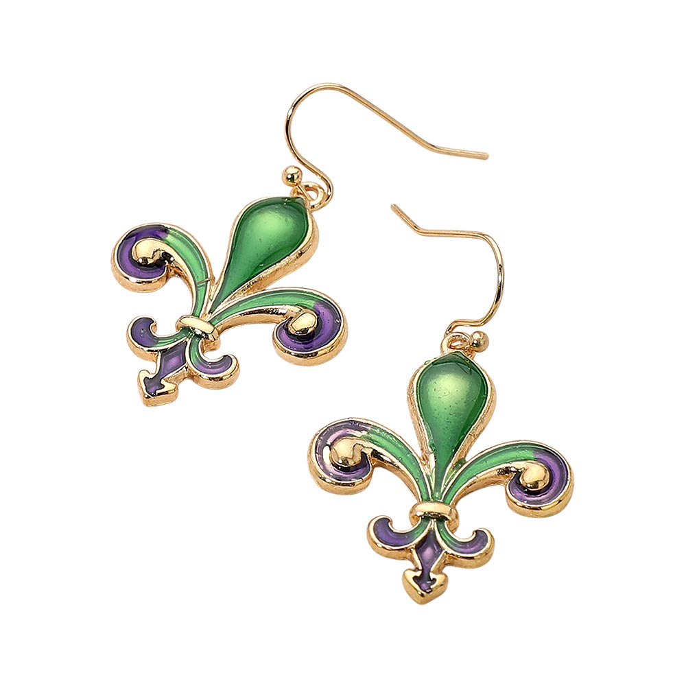 Details • Size : 1" X 1.5" • Fish Hook Back • Show your Mardi Gras pride with these elegant fleur-de-lis earrings. Featuring a smooth enamel finish and metallic detailing, they offer a classic festive look that shines at parades, parties, or any celebration inspired by New Orleans charm. • Lead and Nickel Compliant