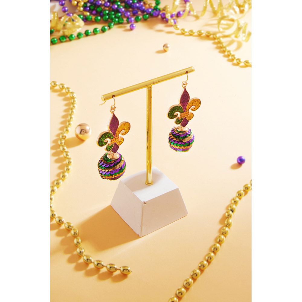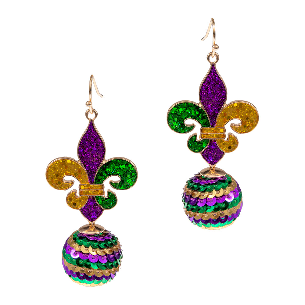 Mardi Gras Glittered Fleur de Lis Sequin Ball Link Dangle Earrings