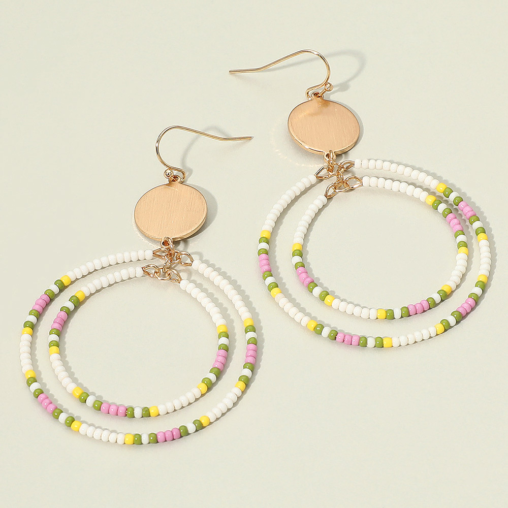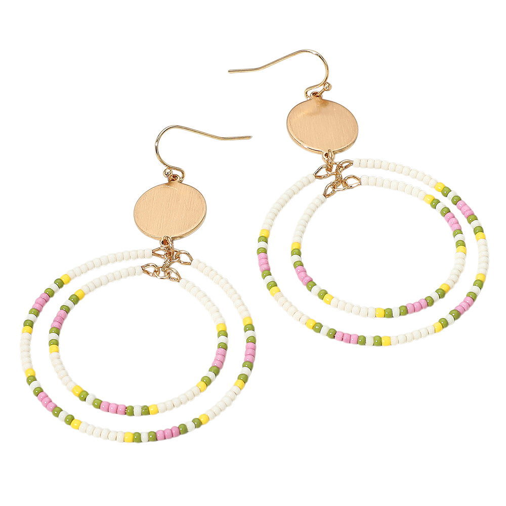 Metal Disc Seed Beaded Double Open Circle Link Dangle Earrings