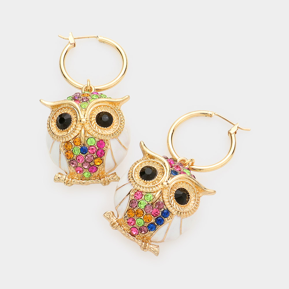 Metal Hoop Rhinestone Embellished Owl Link Pin Catch Earrings