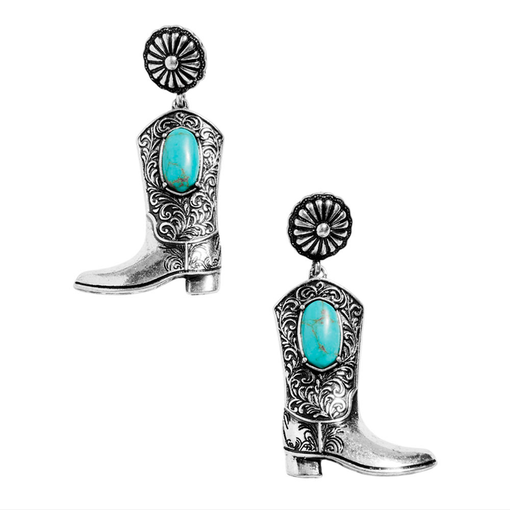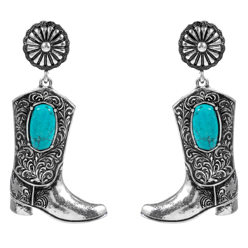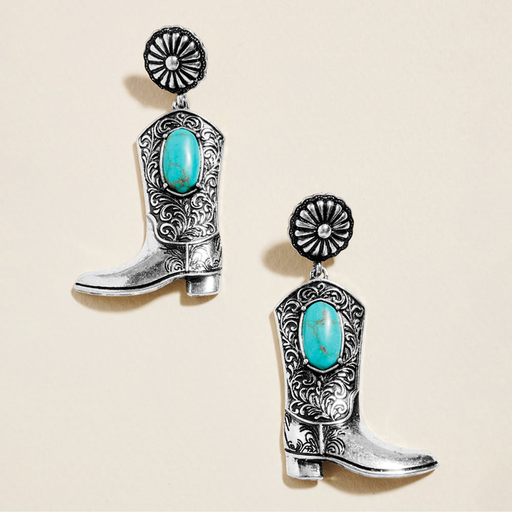 Details • Size : 1.25" X 2.25" • Titanium Post Back • Eye-catching dangle earrings shaped in a classic western boot motif with ornate detailing, made to add bold personality to casual outfits, concerts, festivals, themed events, or everyday styling for fans of statement accessories and standout fashion pieces. • Hypoallergenic • Lead and Nickel Compliant