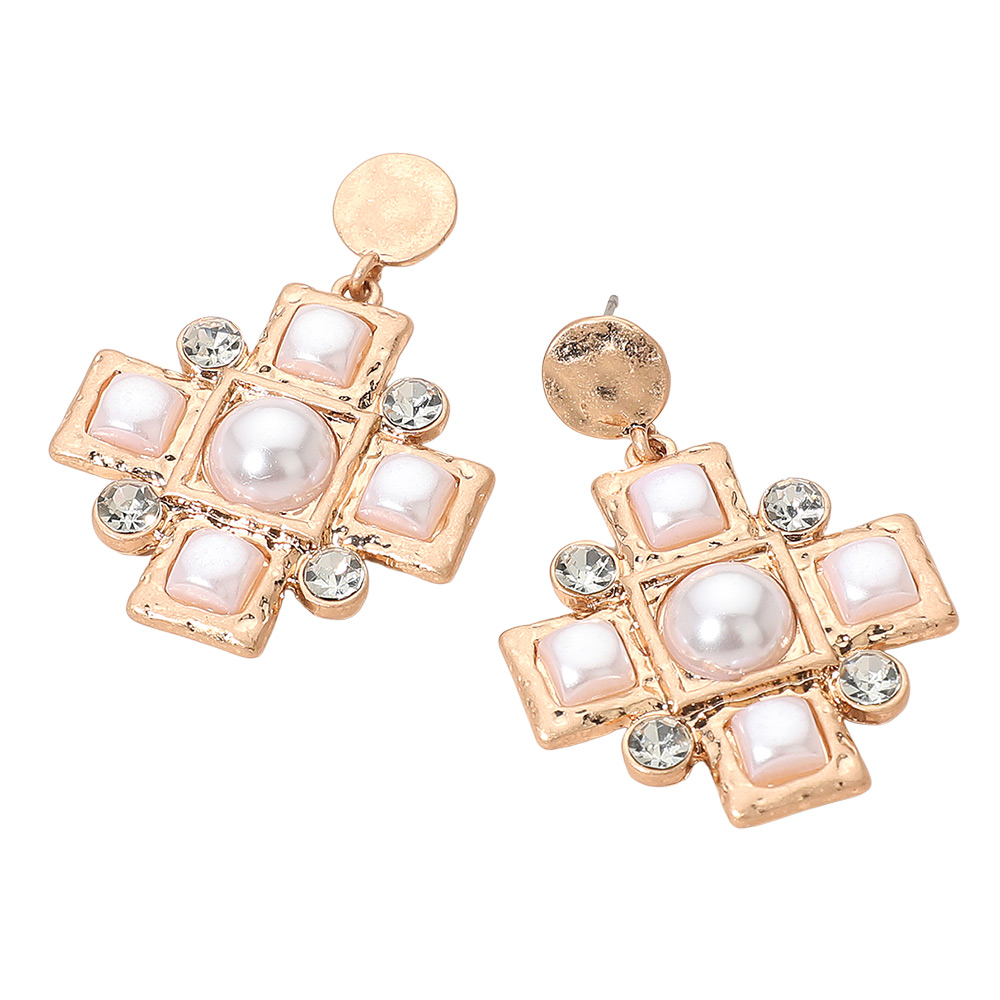 Details • Size : 1.3" X 1.8" • Post Back • Elevate your look with these Geometric Pearl Drop Earrings. Crafted with a cross-shaped design featuring lustrous accents and sparkling embellishments, these earrings offer a perfect blend of modern artistry and timeless sophistication, ideal for both casual and formal occasions. • Lead and Nickel Compliant