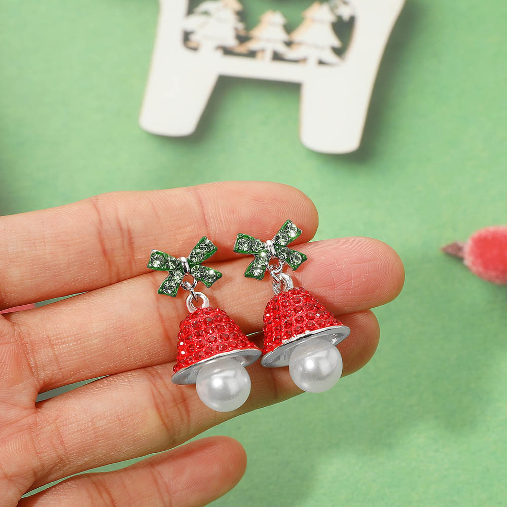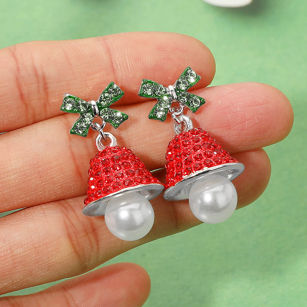 Pearl Bow Accent Rhinestone Studded Holiday Bell Dangle Earrings