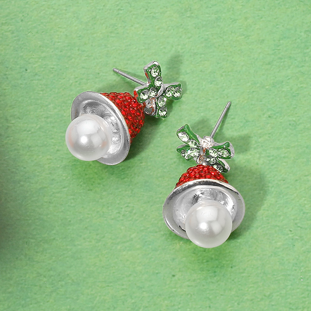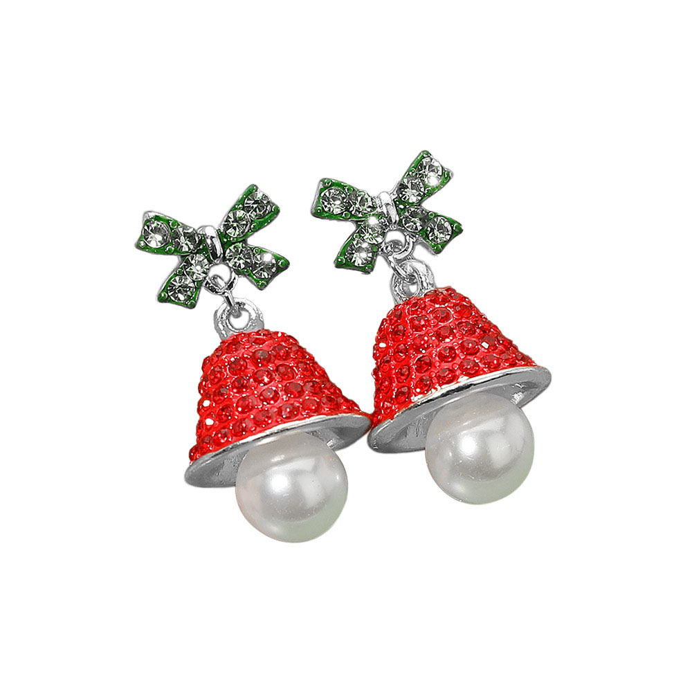 Details • Size : 0.7" X 1.3" • Post Back • Celebrate the season with these holiday bell earrings, featuring sparkling bow details and elegant pearl drops. Perfect for festive gatherings, Christmas parties, or as a charming gift, they bring playful holiday spirit and timeless style to your jewelry collection. • Lead and Nickel Compliant