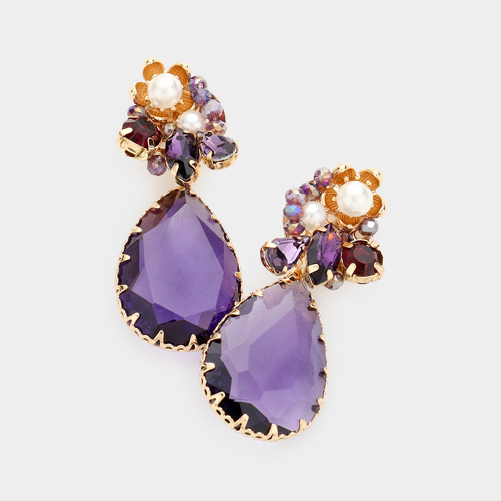Pearl Centered Flower Teardrop Stone Link Dangle Earrings