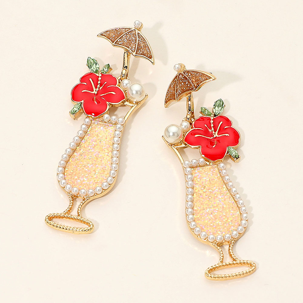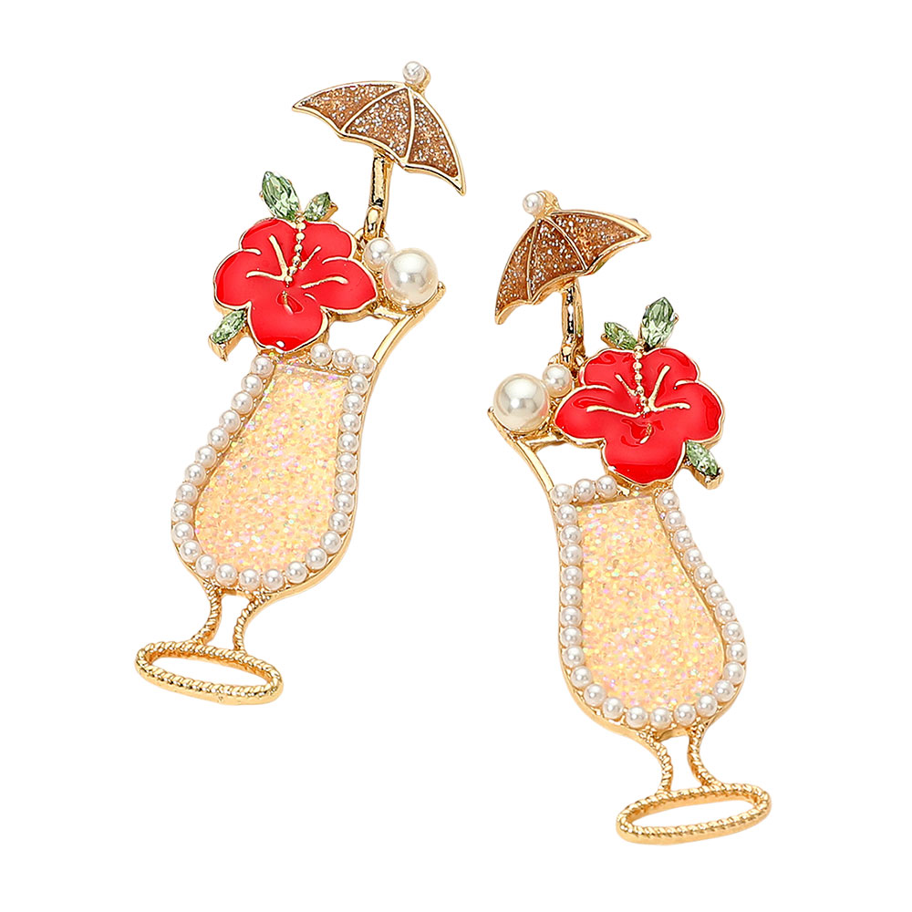 Details • Size : 0.75" X 2.5" • Post Back • Bring vacation vibes anywhere with these tropical cocktail statement earrings. Adorned with sparkling accents, a red flower, and a tiny umbrella, they’re the perfect playful accessory for summer parties, beach outings, or any fun, carefree celebration. • Lead and Nickel Compliant