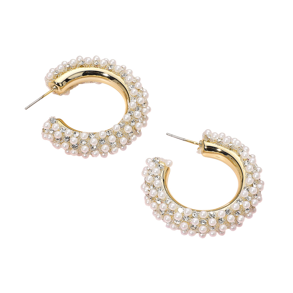 Details • Size : 1.5" X 1.5" X 0.4" • Post Back • These pearl embellished hoop earrings feature a sleek curved silhouette adorned with lustrous beads for a refined and feminine finish. Their radiant shine and modern structure make them a perfect statement piece to elevate casual looks or complement elegant evening ensembles. • Lead and Nickel Compliant