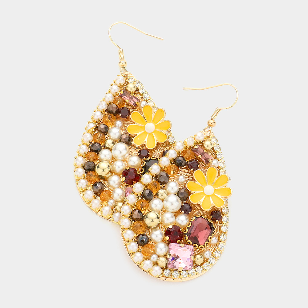 Pearl Flower Stone Bead Embellished Teardrop Dangle Earrings