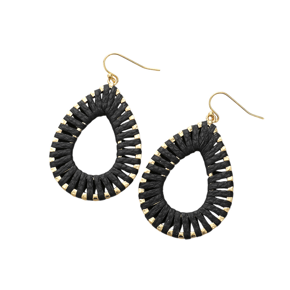 • Woven teardrop earrings with an open center design and intricate faux leather wrap detail. Lightweight and eye-catching, these dangle earrings add a bold, artisanal flair to any outfit. Ideal for casual or vacation-ready looks.