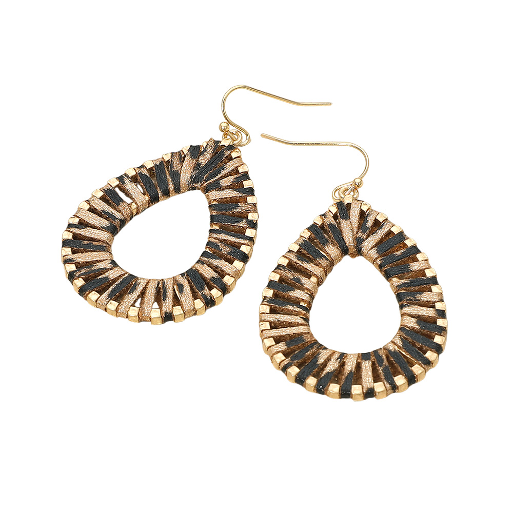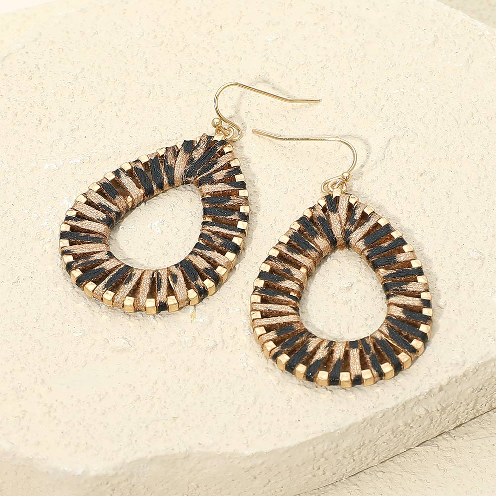 • Woven teardrop earrings with an open center design and intricate faux leather wrap detail. Lightweight and eye-catching, these dangle earrings add a bold, artisanal flair to any outfit. Ideal for casual or vacation-ready looks.