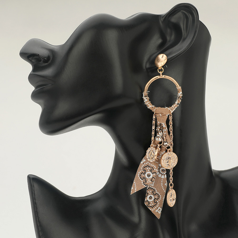 • Bold and stylish statement drop earrings featuring a fabric-wrapped hoop, cascading chains, and detailed coin charms. Perfect for adding an edgy, bohemian-inspired touch to casual outfits or dressing up evening looks, these earrings bring unique flair and chic elegance.