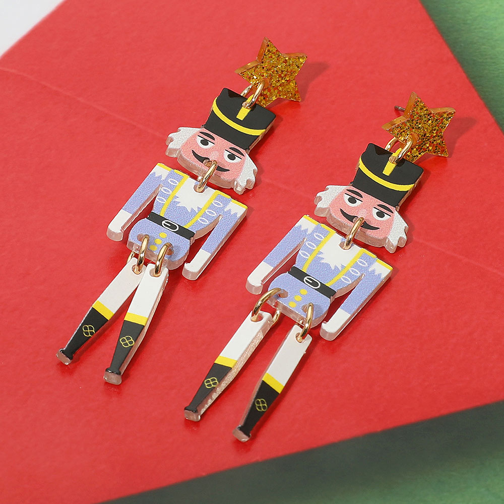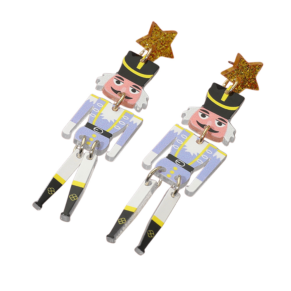 Details • Size : 0.7" X 3.2" • Post Back • Celebrate festive charm with these nutcracker soldier drop earrings featuring glittering star studs and playful detailing. Lightweight and eye-catching, they’re perfect for holiday parties, seasonal outfits, or adding whimsical fun to your jewelry collection with a touch of festive flair. • Lead and Nickel Compliant