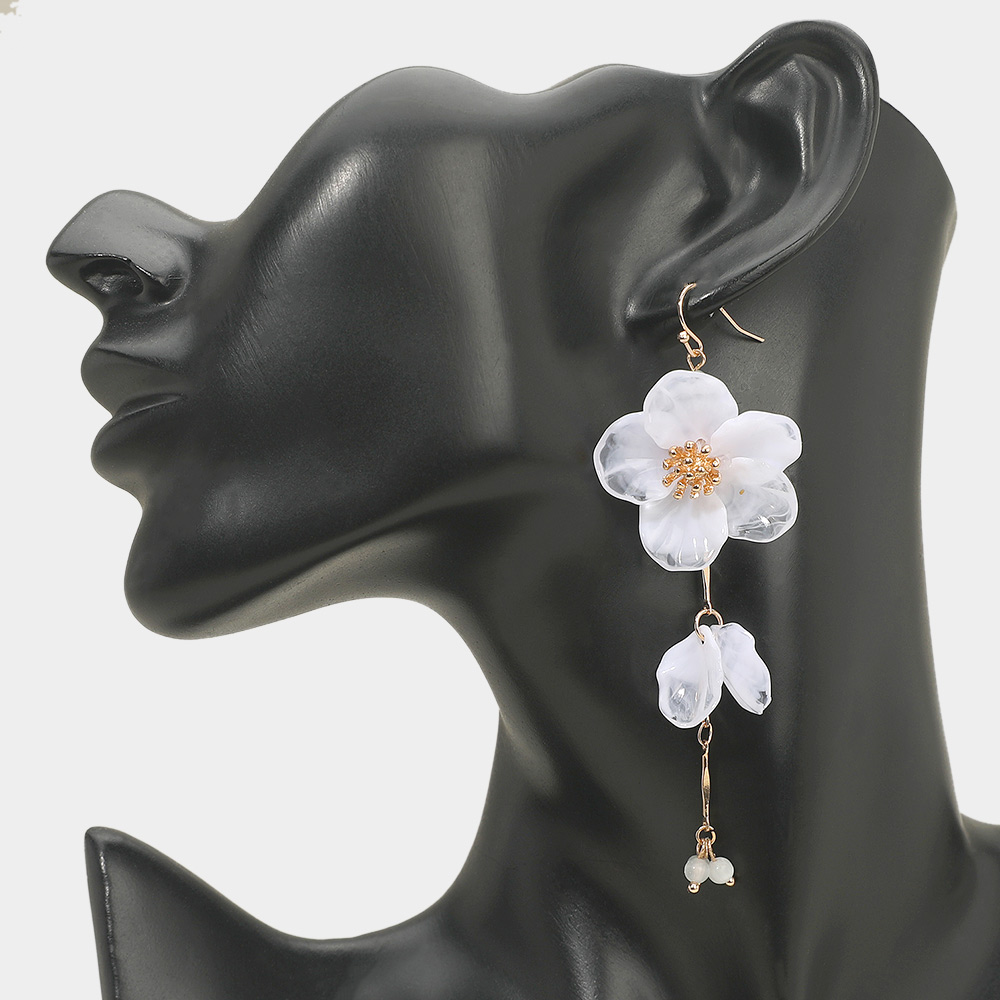 Details • Size : 1.25" X 3.75" • Fish Hook Back • Elegant long drop earrings featuring layered floral petals and delicate clustered accents for a soft, romantic look. Perfect for weddings, parties, garden events or adding graceful botanical charm to everyday style with their airy, feminine movement. • Lead and Nickel Compliant
