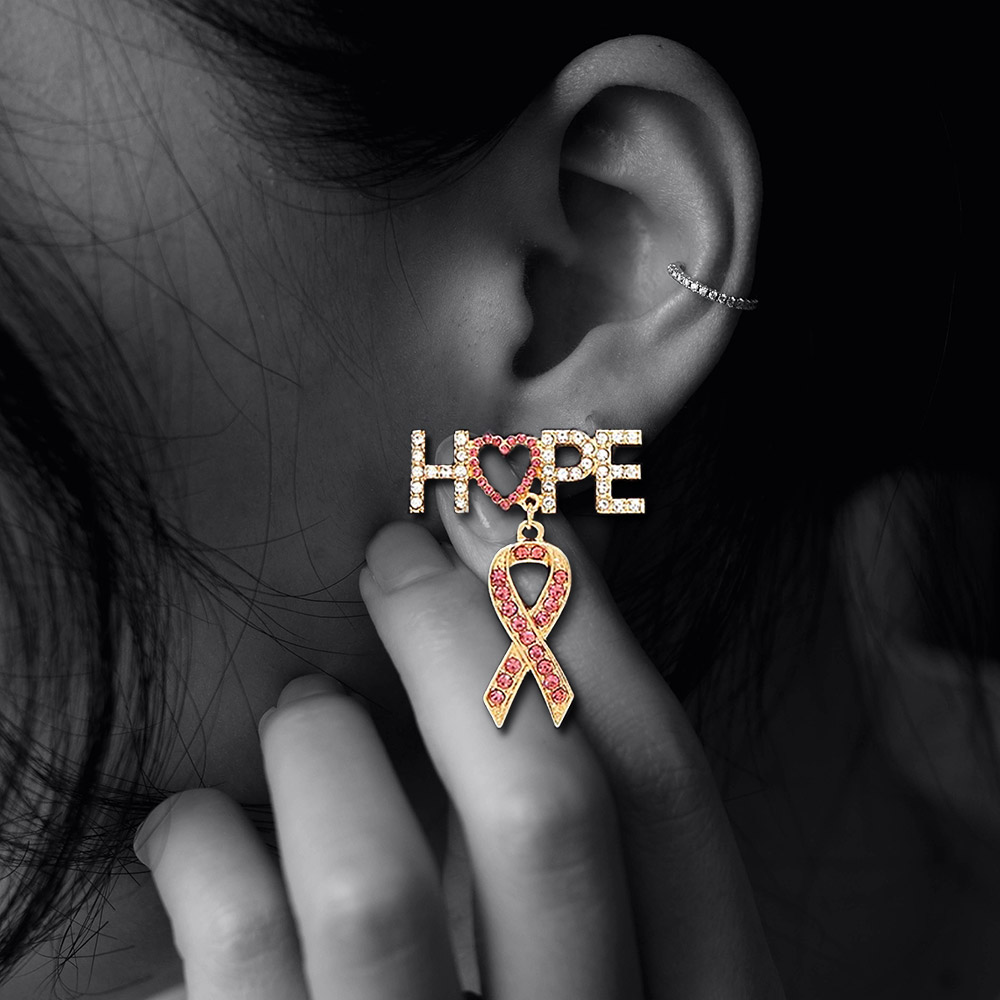 • Stylish drop earrings featuring the word “HOPE” and a sparkling awareness ribbon charm. A powerful accessory to support meaningful causes with elegance and shine.