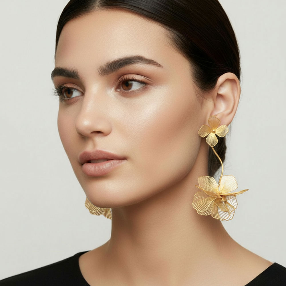 • These Sculpted Bloom Statement Earrings feature a delicate floral motif with an artistic curved stem for a graceful, modern look. Designed to make an impression, they blend elegance and creativity—perfect for evening wear, special occasions, or adding flair to any outfit.