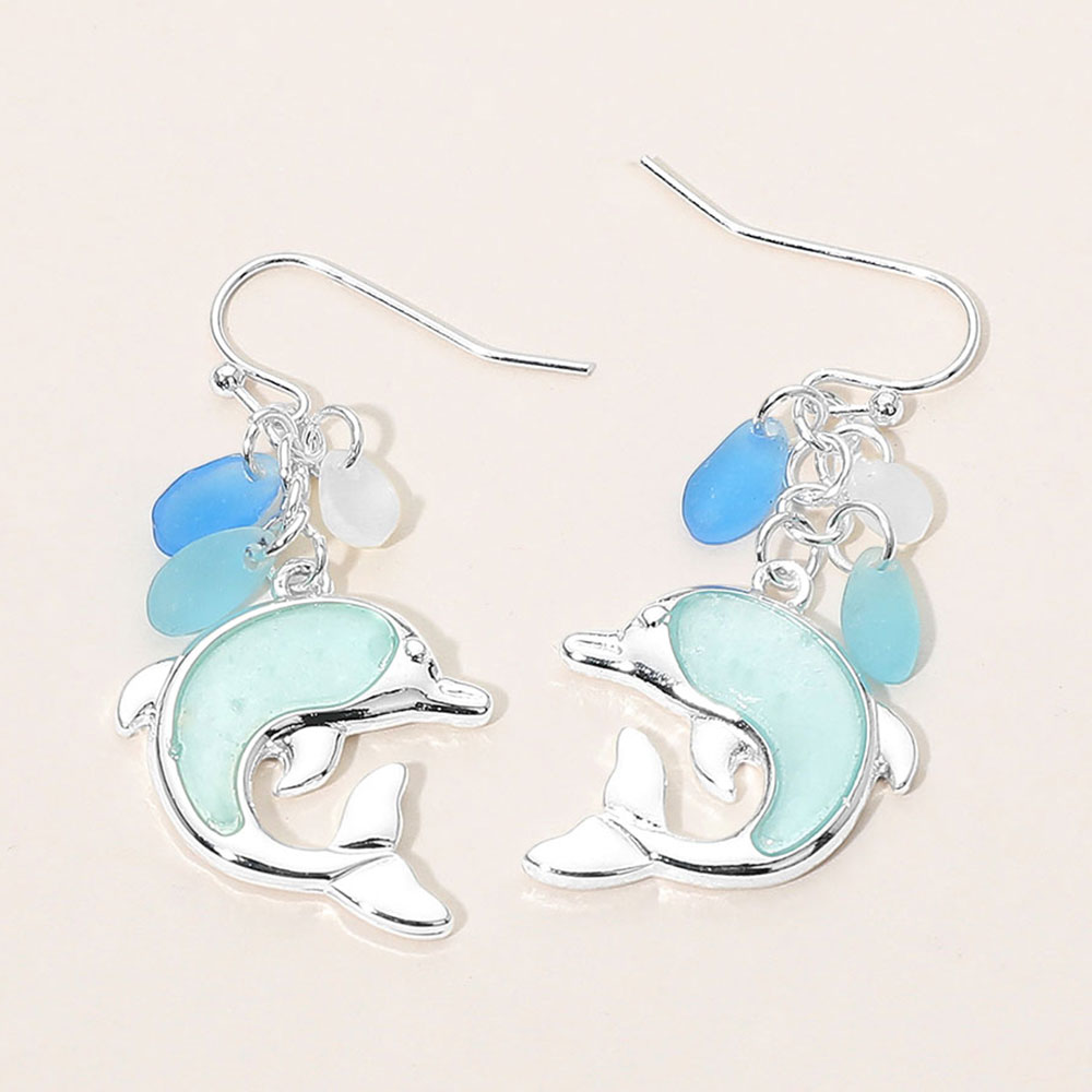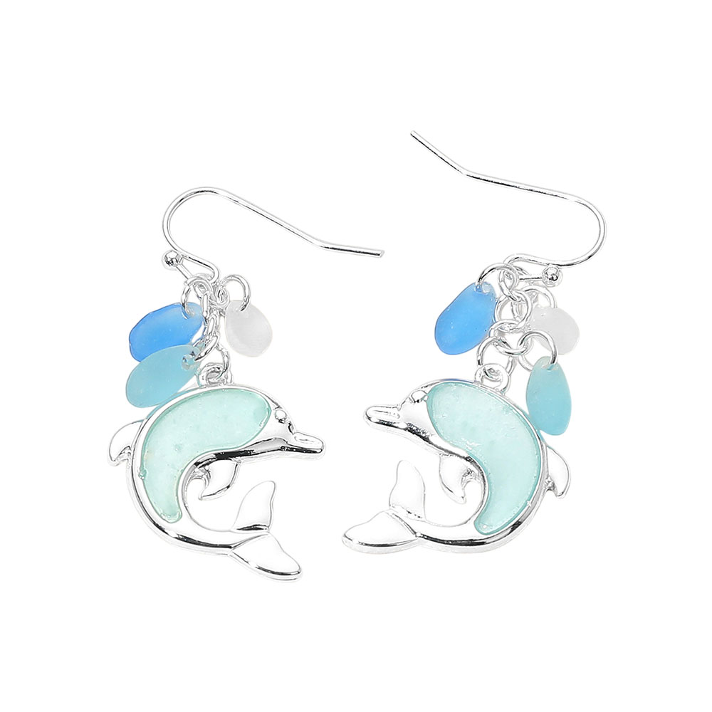 Sea Glass Dolphin Charm Drop Dangle Earrings