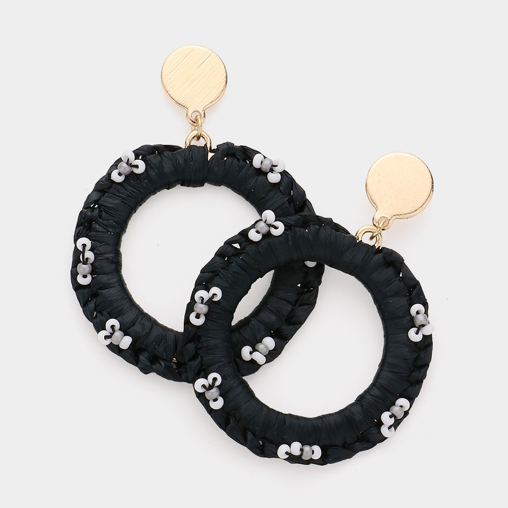 Seed Bead Embellished Raffia Open Circle Dangle Earrings