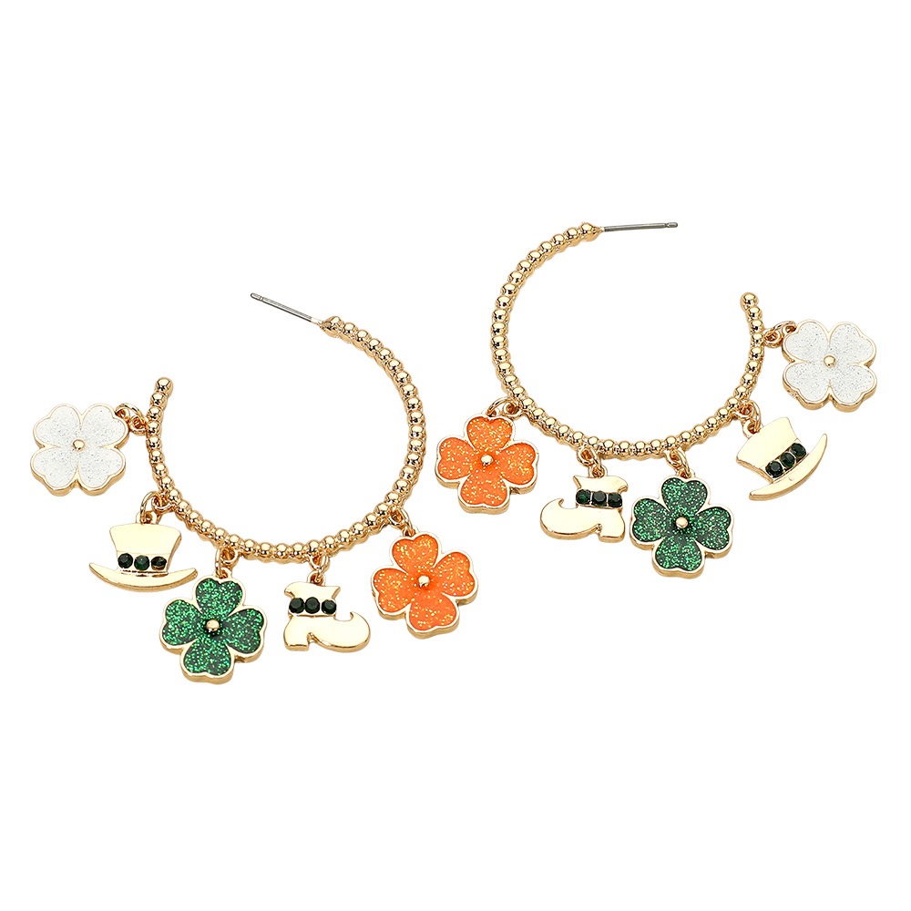 Details • Size : 2" X 2.4" • Post Back • Festive charm hoop earrings inspired by St. Patrick’s Day, featuring playful themed icons that add movement and personality. Designed to stand out at parades, parties, and seasonal events while complementing holiday outfits. A fun statement accessory for themed collections, gifting, and retail displays. • Lead and Nickel Compliant