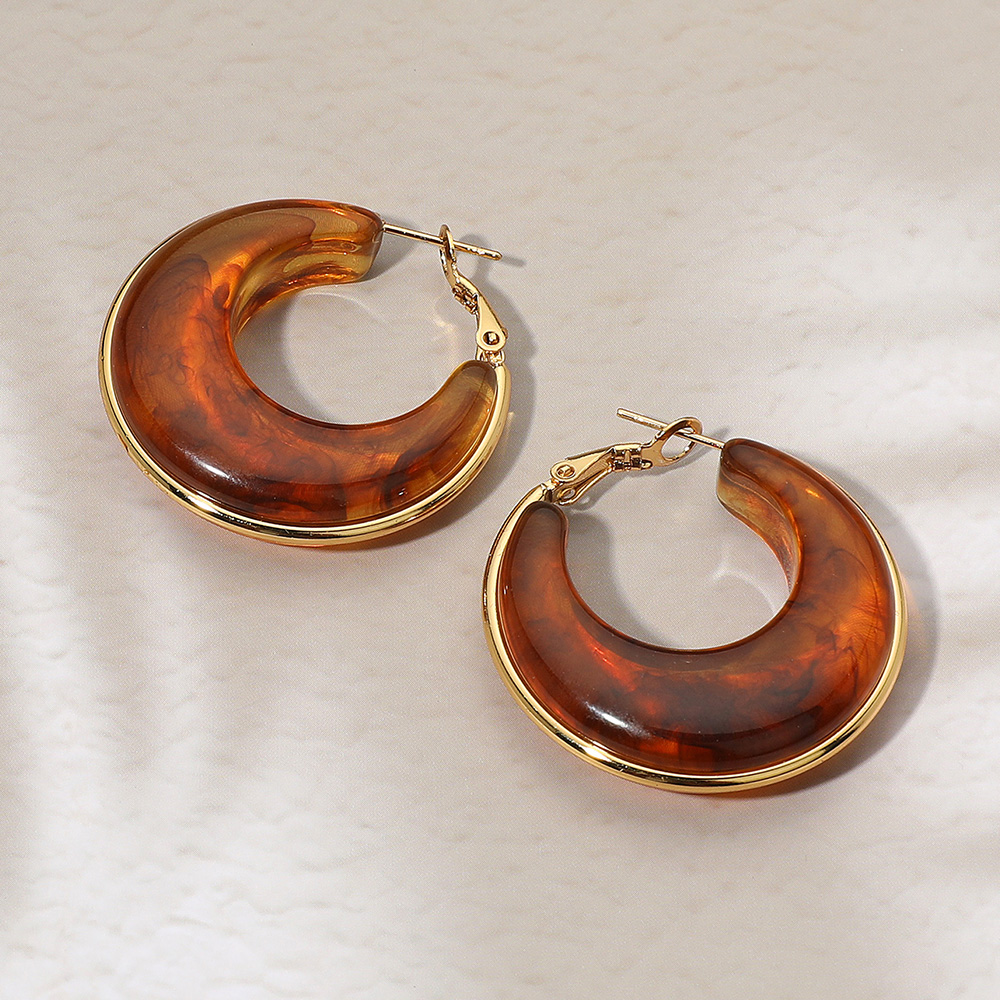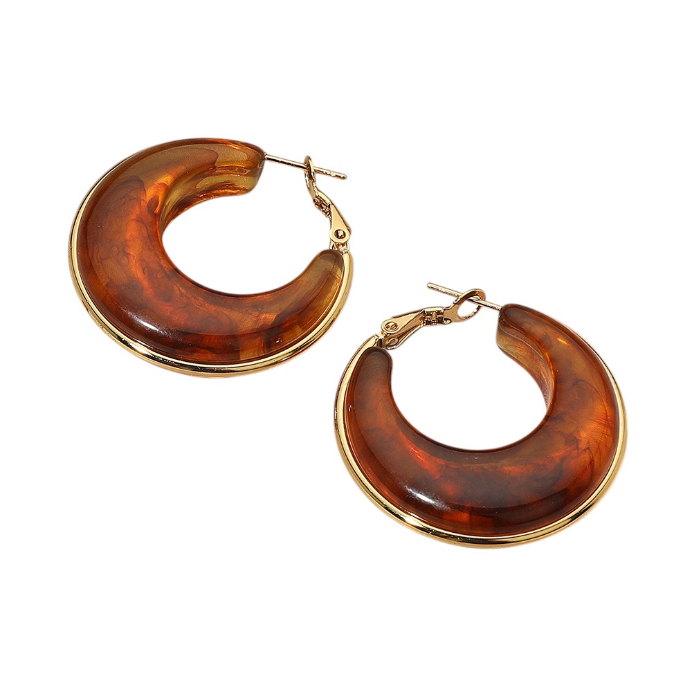 Details • Size : 1.4" X 1.4" • Omega Back • Bold hoop earrings crafted with a marbled resin design framed in sleek gold trim. The unique mix of texture and shine creates a statement piece that’s modern yet versatile. Lightweight and easy to wear, these hoops add a chic touch to both everyday looks and evening outfits. • Lead and Nickel Compliant • Stainless Steel