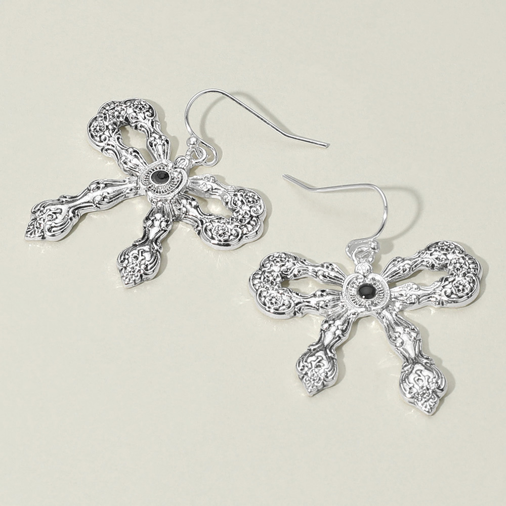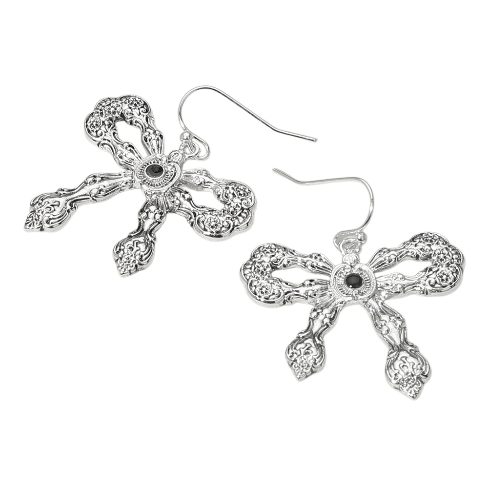 Details • Size : 1.3" X 1.5" • Fish Hook Back • Delicate bow-shaped drop earrings featuring intricate vintage-inspired detailing and a small center accent. Perfect for adding a feminine and romantic flair to any outfit, these lightweight earrings are ideal for both casual wear and special occasions. A charming gift choice. • Lead and Nickel Compliant