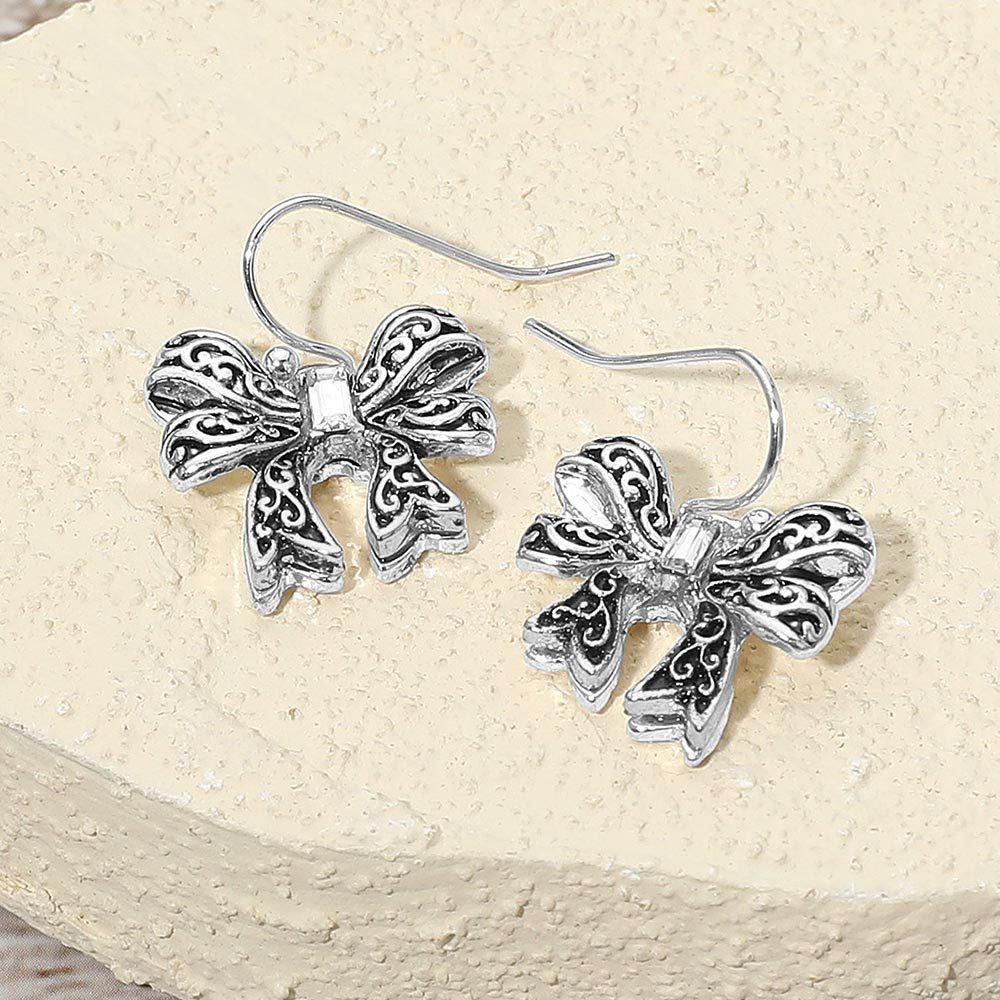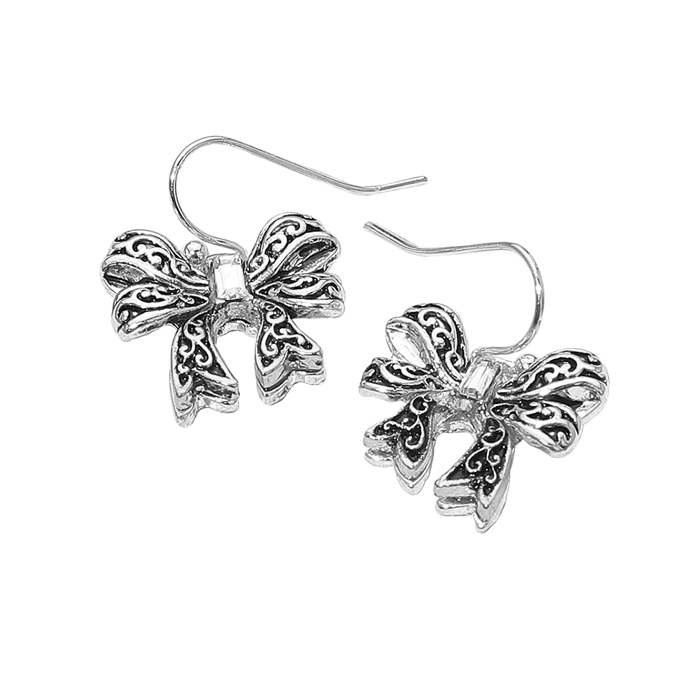 Details • Size : 0.75" X 1" • Fish Hook Back • Add a touch of charm with these vintage bow drop earrings featuring intricate filigree detailing. Lightweight and stylish, they are perfect for everyday wear or special occasions, offering a playful yet elegant design that complements both casual and dressy outfits effortlessly. • Lead and Nickel Compliant