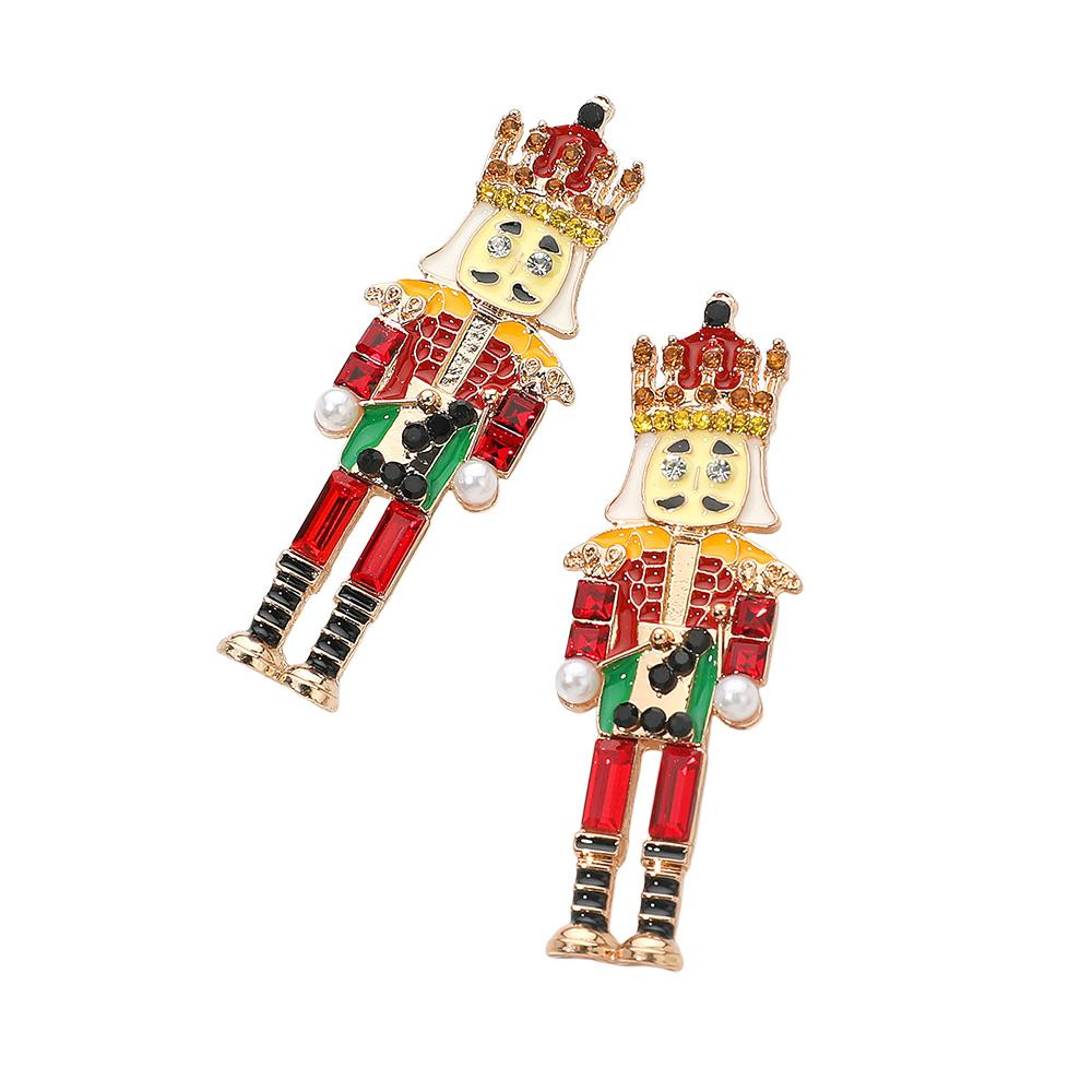 Details • Size : 0.75" X 2.2" • Post Back • Add a touch of whimsy to your holiday style with these jeweled nutcracker drop earrings. Designed with intricate detailing and brilliant embellishments, they capture festive elegance while offering a playful yet sophisticated charm perfect for special occasions. • Lead and Nickel Compliant